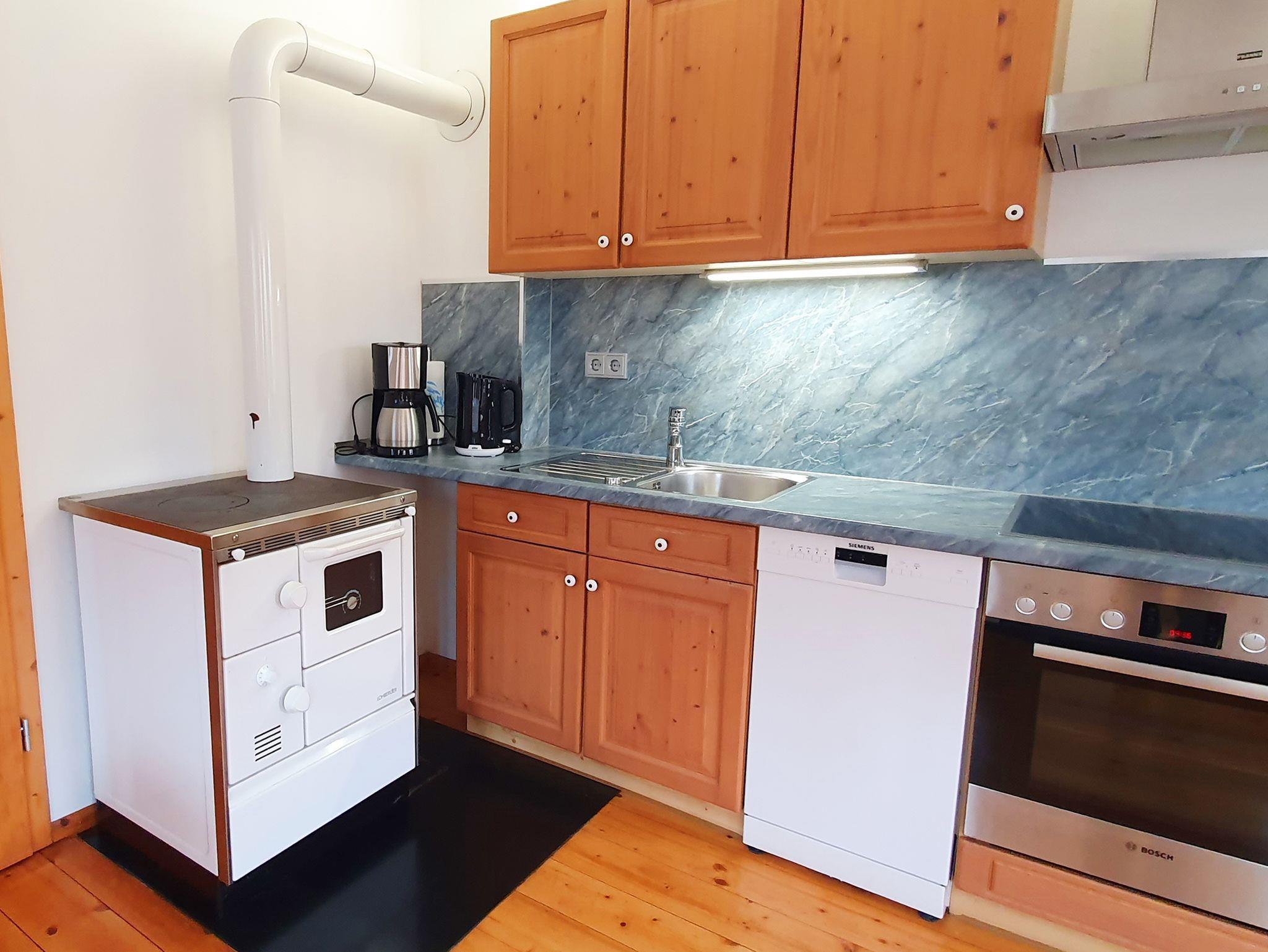 Gemütlicher Wohnraum mit Schlafcouch, 1 Schlafzimmer mit Doppelbett, Sat-TV, Bad/Dusche, WC extra, Z-Heizung und Holzofen, Terrasse, Holz- und Fliesenböden, Nichtraucher, Erdgeschoß, familienfreundlich, Naturlandbiobetrieb, Liegewiese. Die Schlafcouch ist gut geeignet für 2 Erwachsene oder 2 Kinder und hat eine seperate Matraze. Ein Kinderbett oder Kinderreisebett kann kostenlos zur Verfügung gestellt werden, um den Wohnraum frei zu halten. Die Küche ist vollausgestattet mit Spülmaschine und Kühl-/Gefrierkombination.