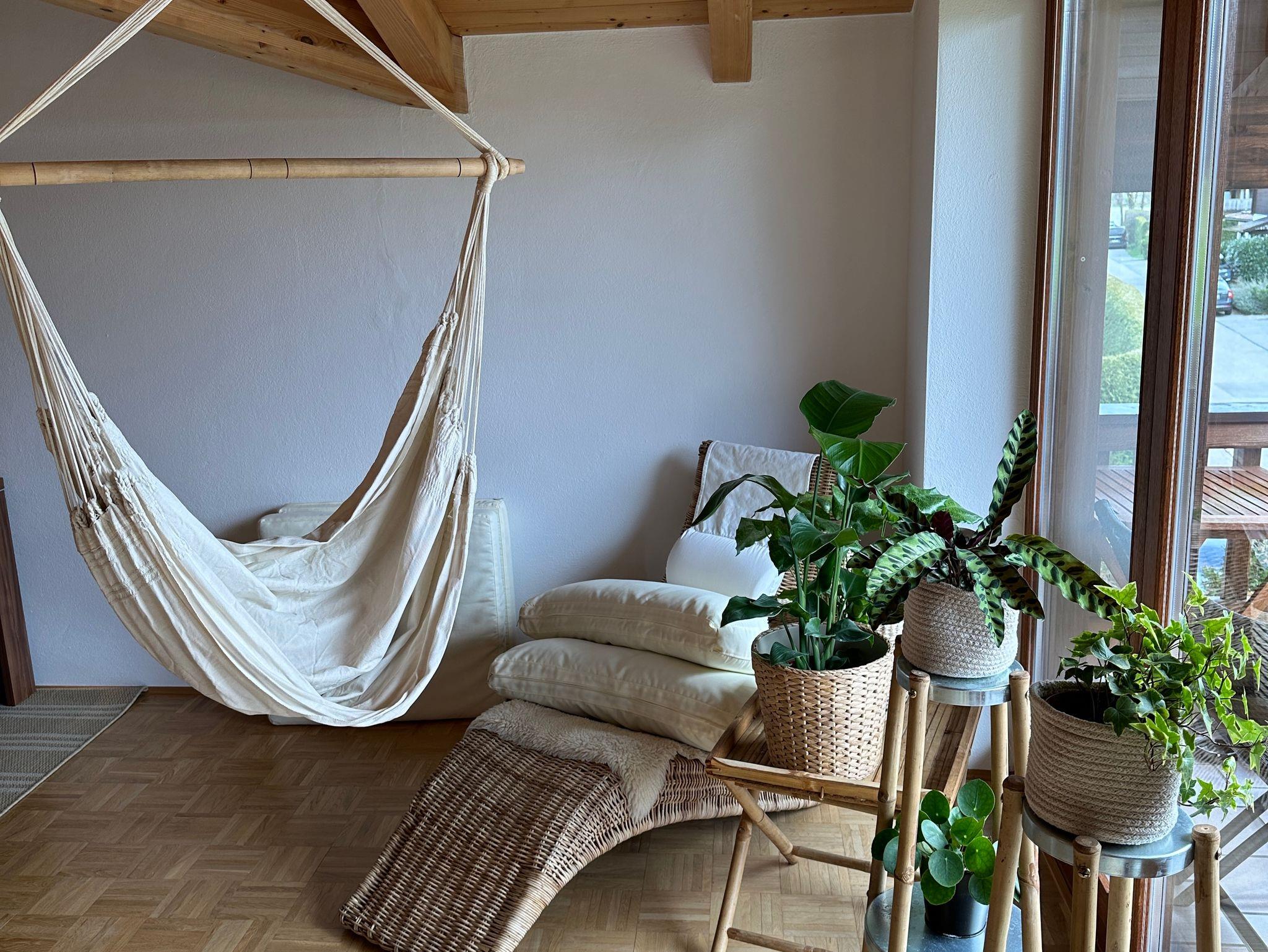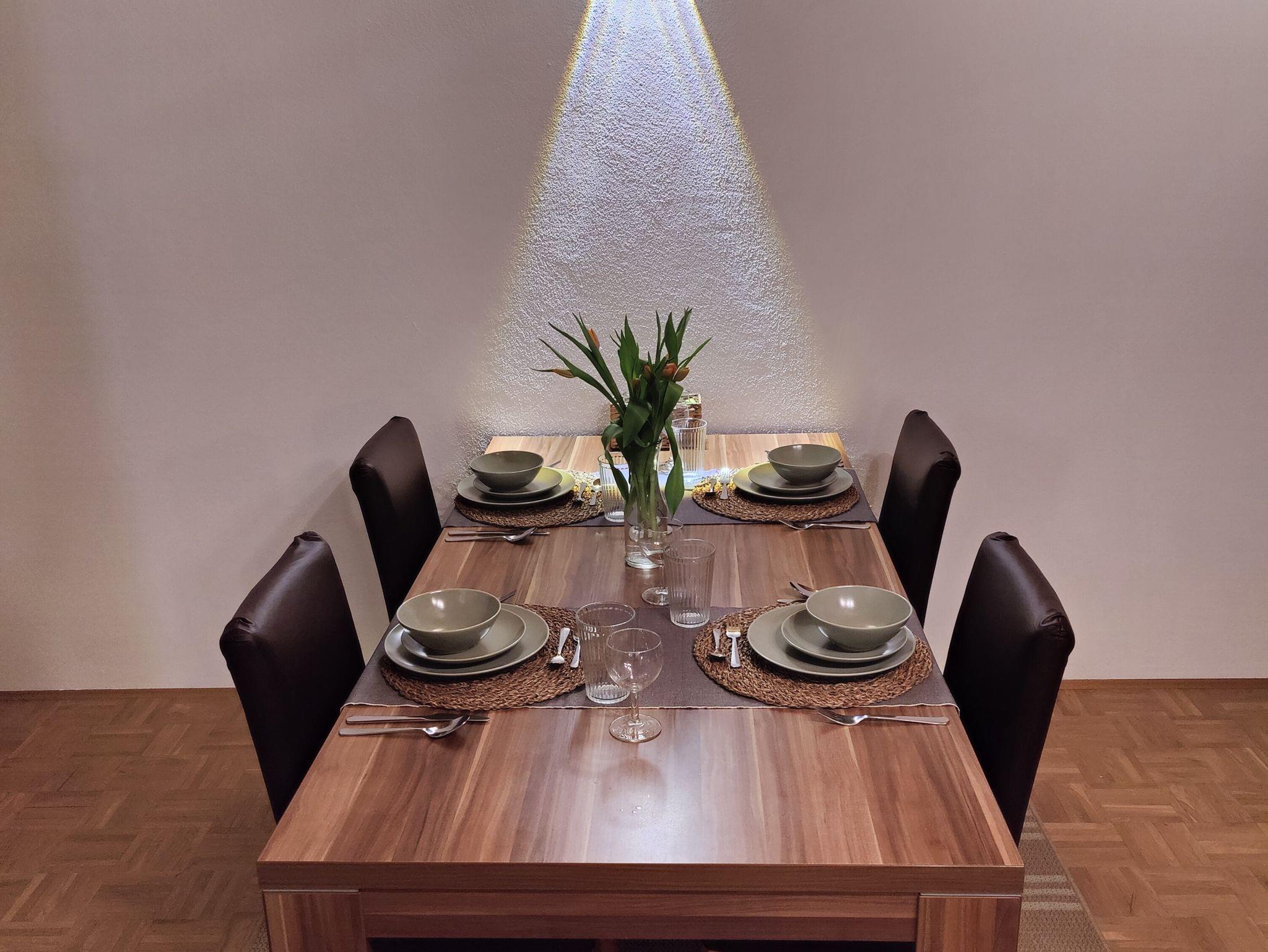 • Ein Wohnzimmer mit großen Fernseher, einer Ausziehcouch die Platz für 2 Personen bietet, einem großen Esstisch, einem Hochtisch und einem einer Lese/Sonnenecke beim Balkon. Und natürlich der Balkon selber der Ihnen Aussicht auf die zwei Seiten des Voralpengebietes gibt. Auf diesem Balkon befindet sich auch ein Tisch mit 2 Stühlen und eine kleine Couchgarnitur.