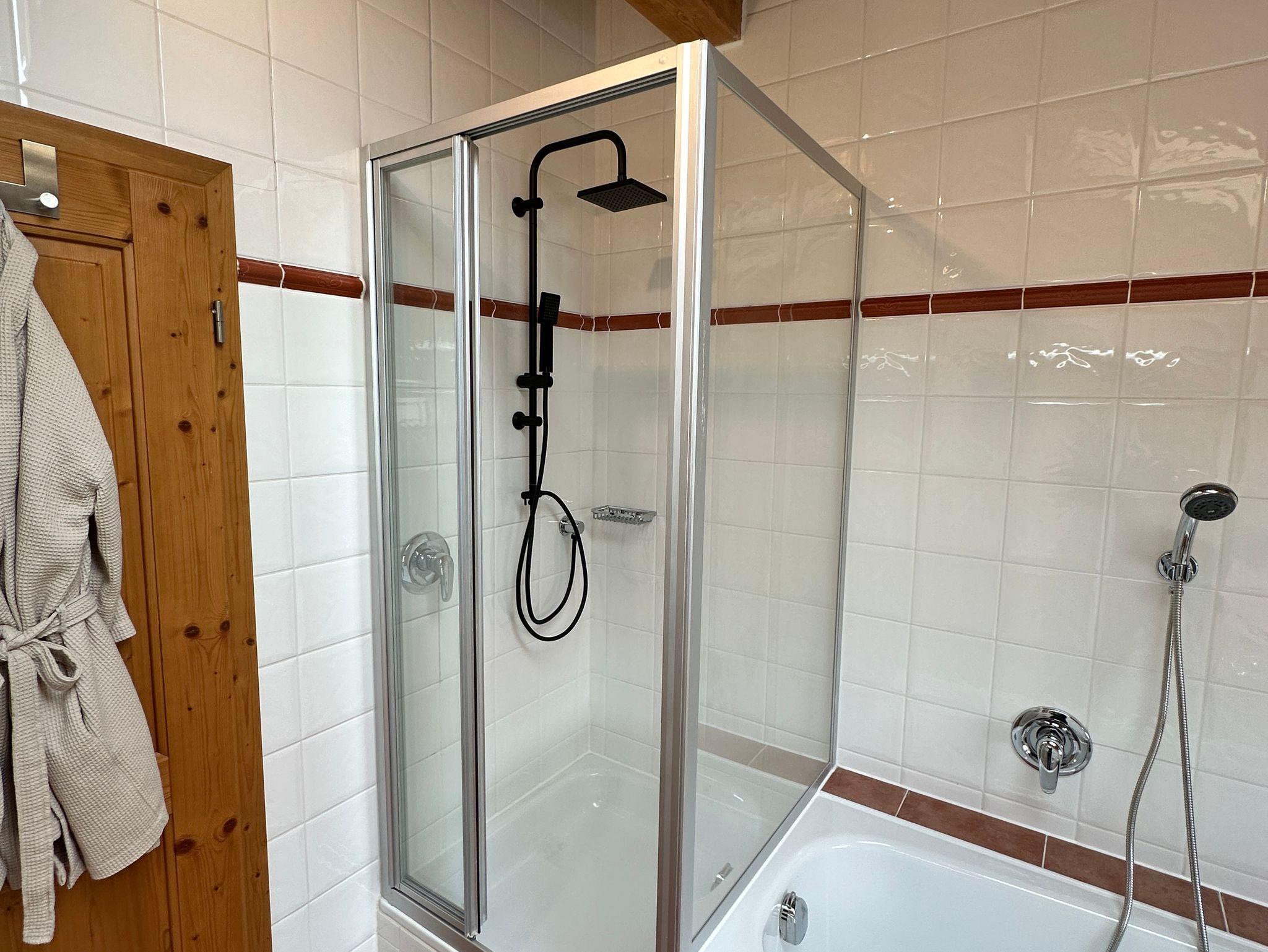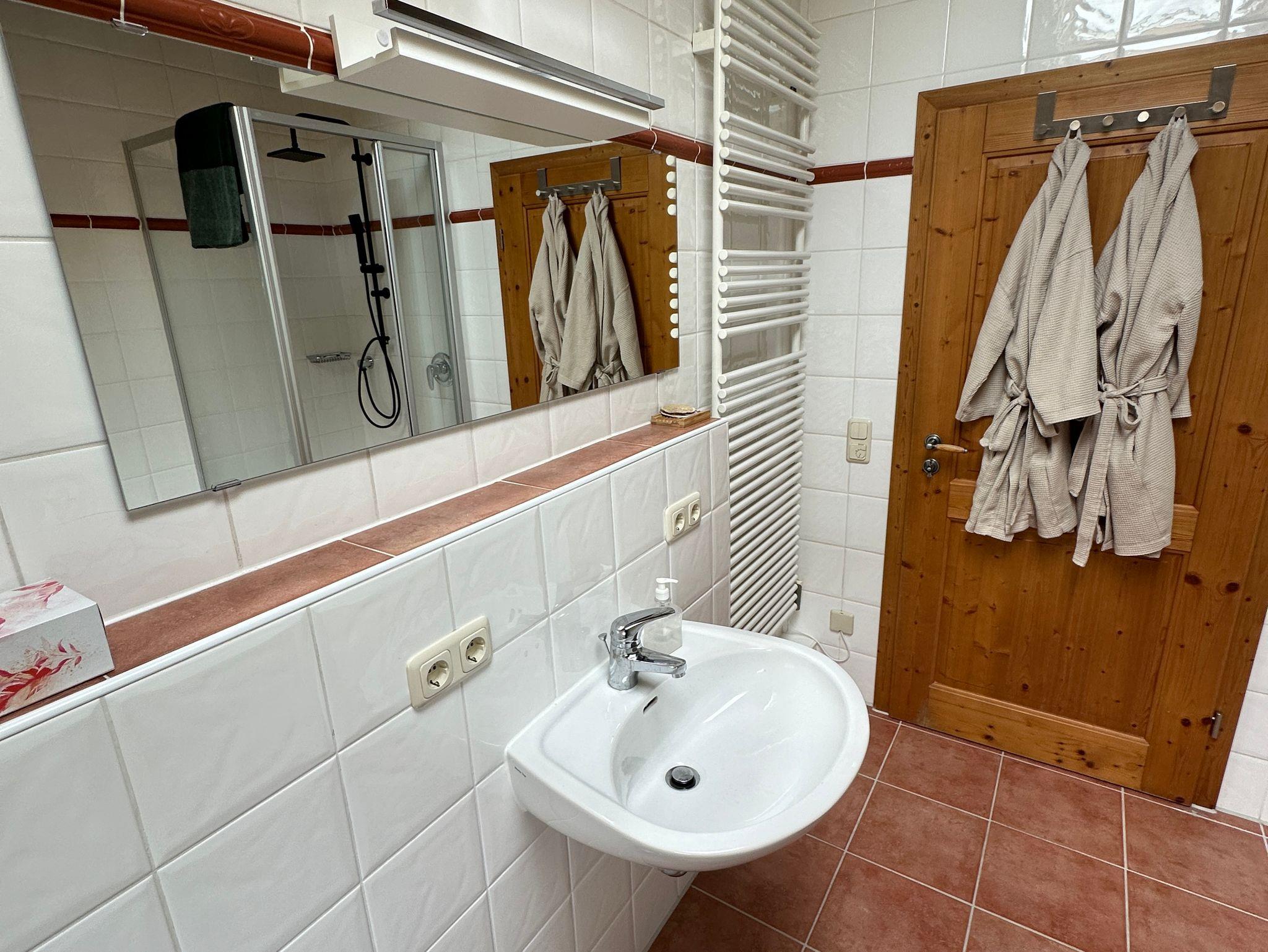 • Ein Badezimmer ist ausgestatte mit einer Waschmachine, einer Regenwald Dusche und einer Badewanne für Ihre Entspannung.