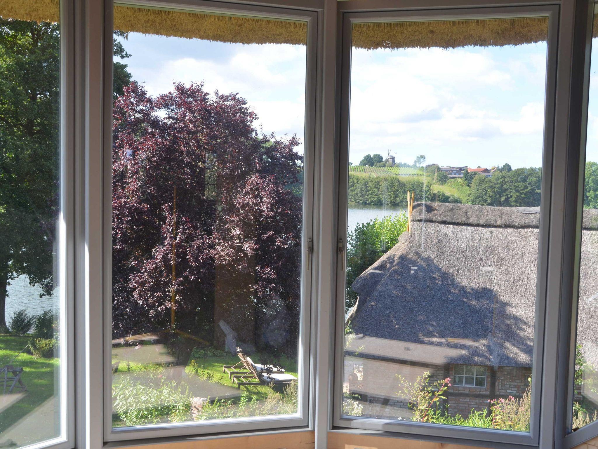 Die einmalige Fachwerkkonstruktion mit Verglasung fast der gesamten Längsseite gibt einen malerischen Blick auf See, Wald und holsteinische Hügellandschaft frei.