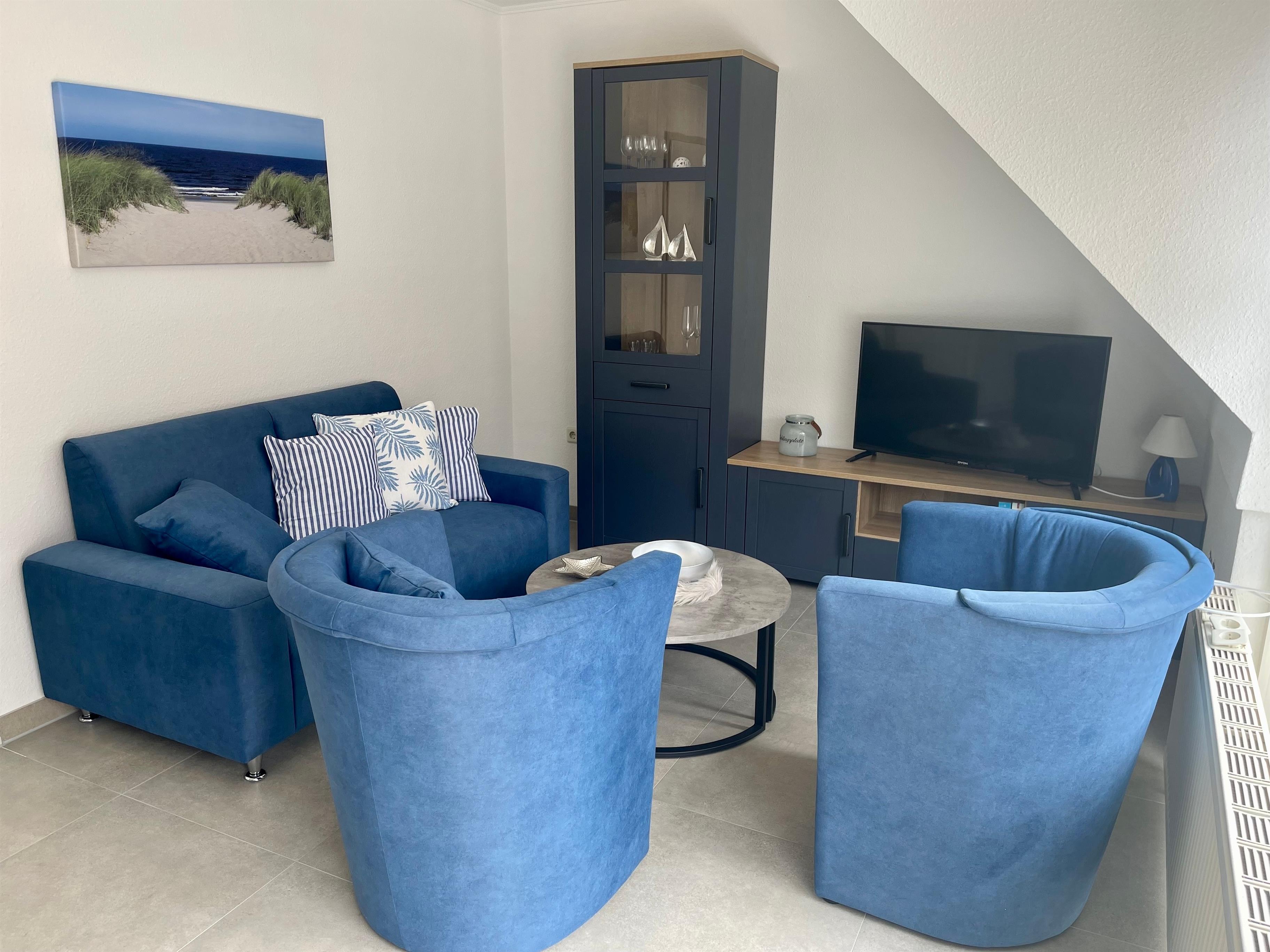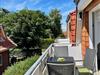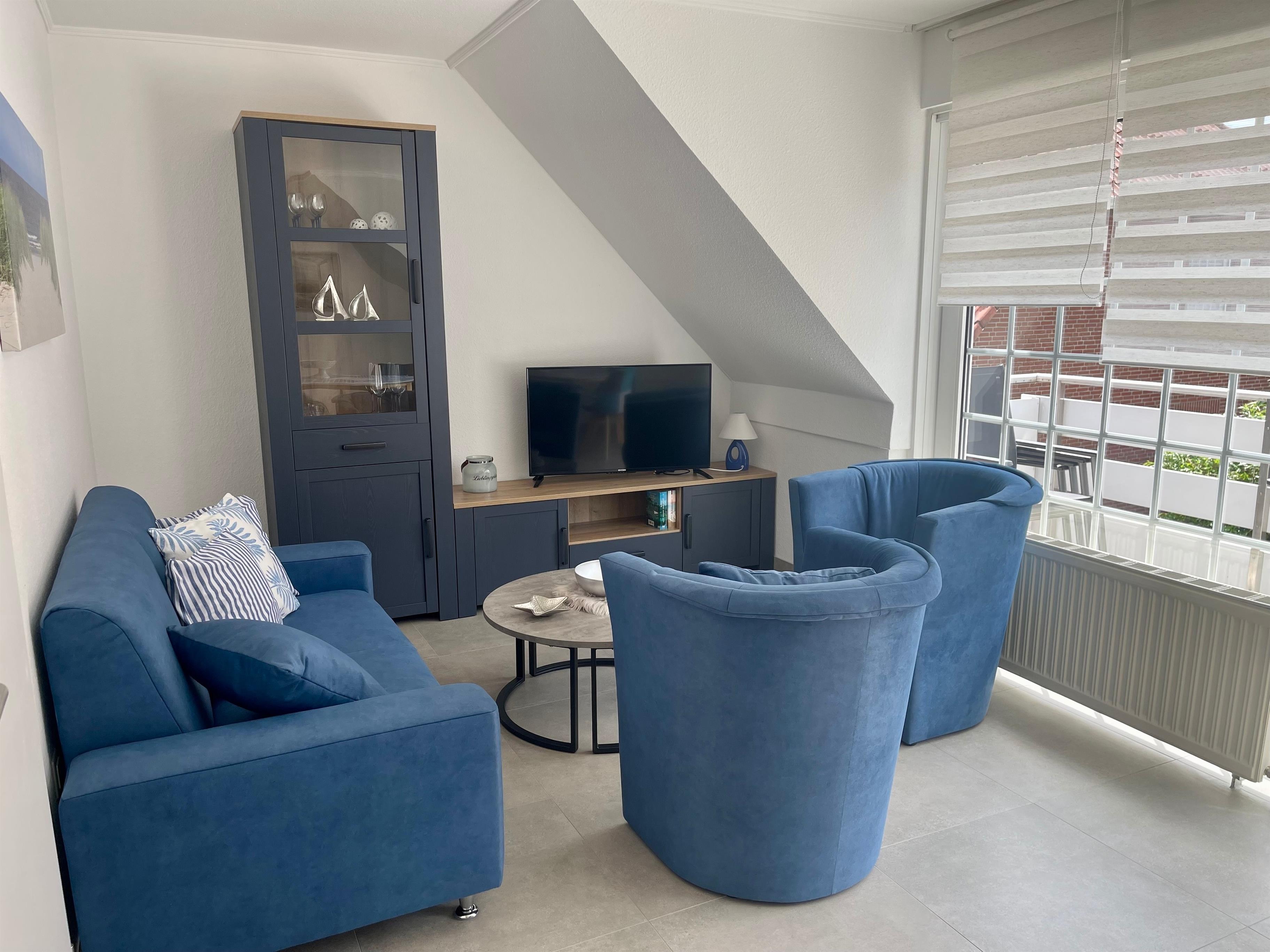 Ein heller Wohnraum mit gemütlichem Sofa und Sesseln hat direkten Zugang zum großen Balkon.