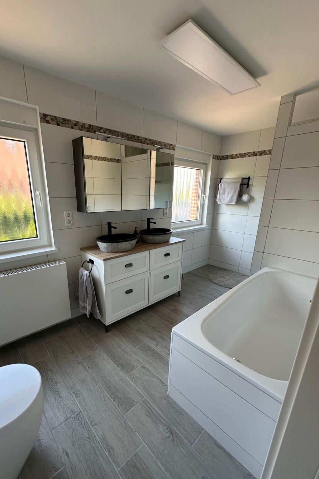 Bathroom: WC, bathtub, shower, double washbasin, illuminated mirror cabinet, 2 windows