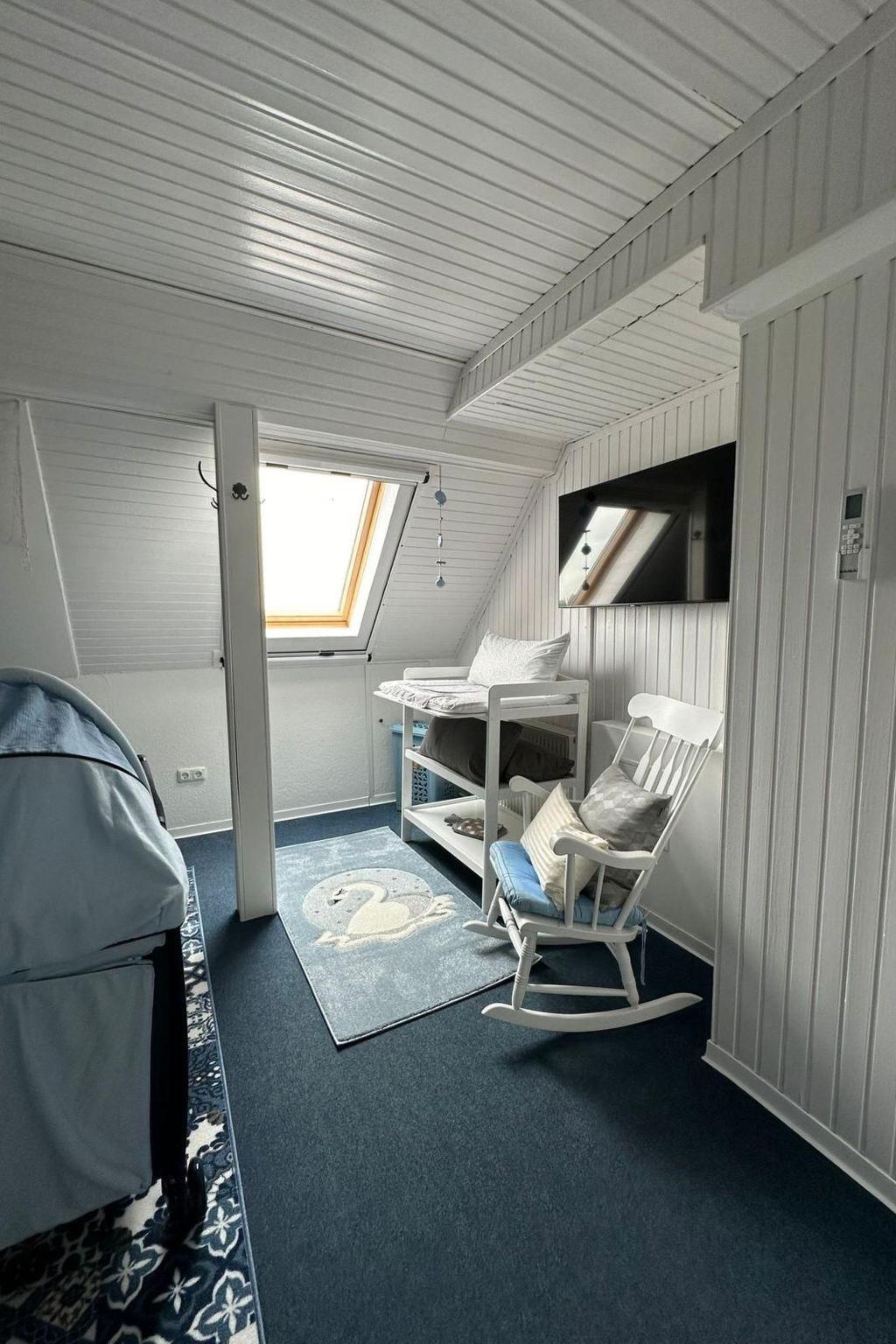 There are 3 lovingly furnished bedrooms on the upper floor. There is a bedroom with a double bed, travel cot, changing unit and Smart TV, a bedroom with two single beds and a bedroom with a double bunk bed and slide. The "master bedroom" and the living room are also equipped with air conditioning.