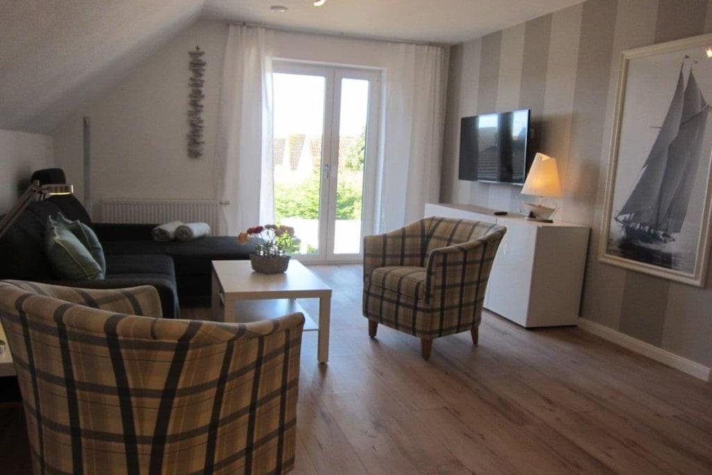 På 1. etage: (åbent køkken(, , Fjernsyn, spisebord, kakkelovn, kogeplade, elkedel, brødrister, kaffemaskine, ovn, mikrobølgeovn, opvaskemaskine , køleskab, fryser), soveværelse(, dobbeltseng), soveværelse(, dobbeltseng, Fjernsyn), badeværelse(, toilet, badekar, bruser, håndvask, varme)) , , , , carport, Internetadgang, Internetadgang, balkon(, havemøbler), varme, terrasse(Strand, havemøbler), strygejern