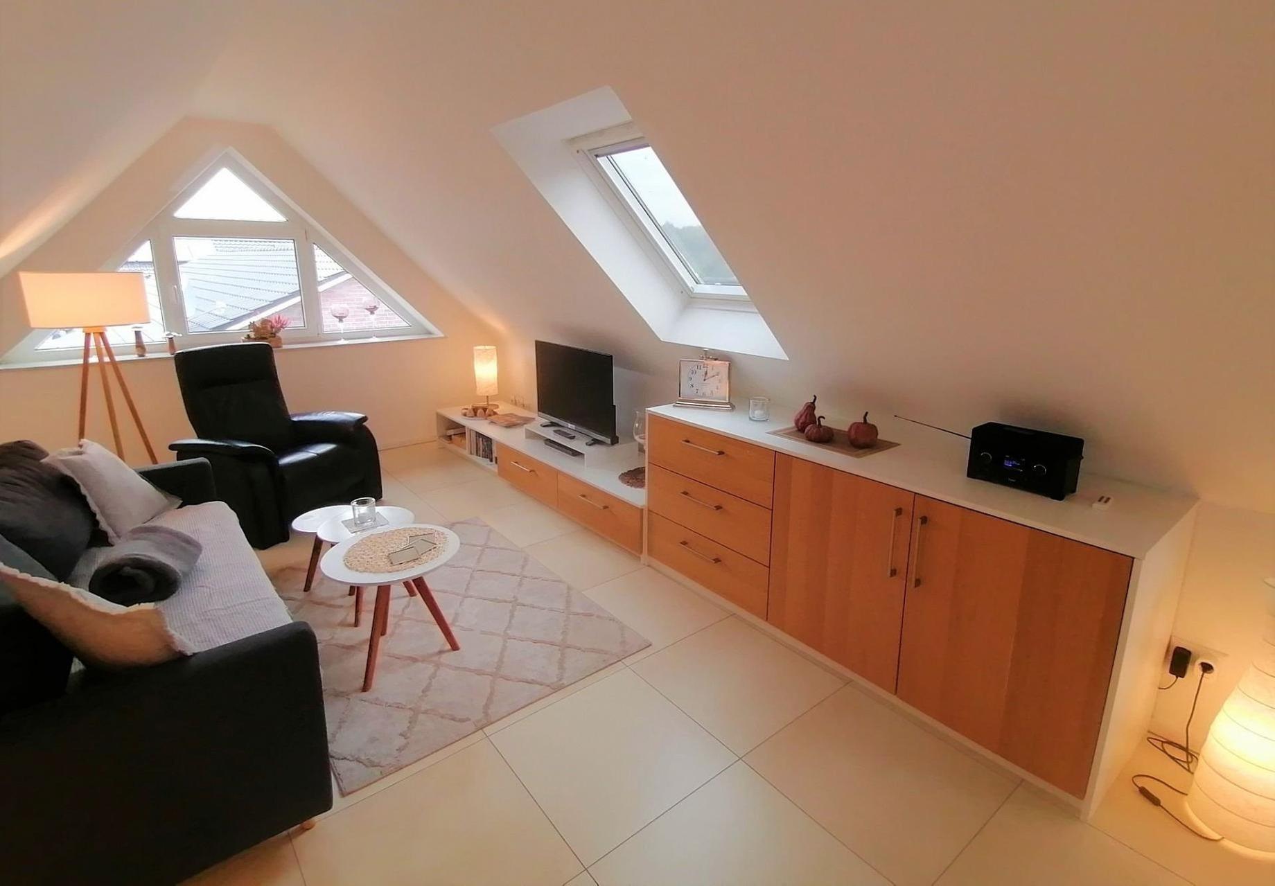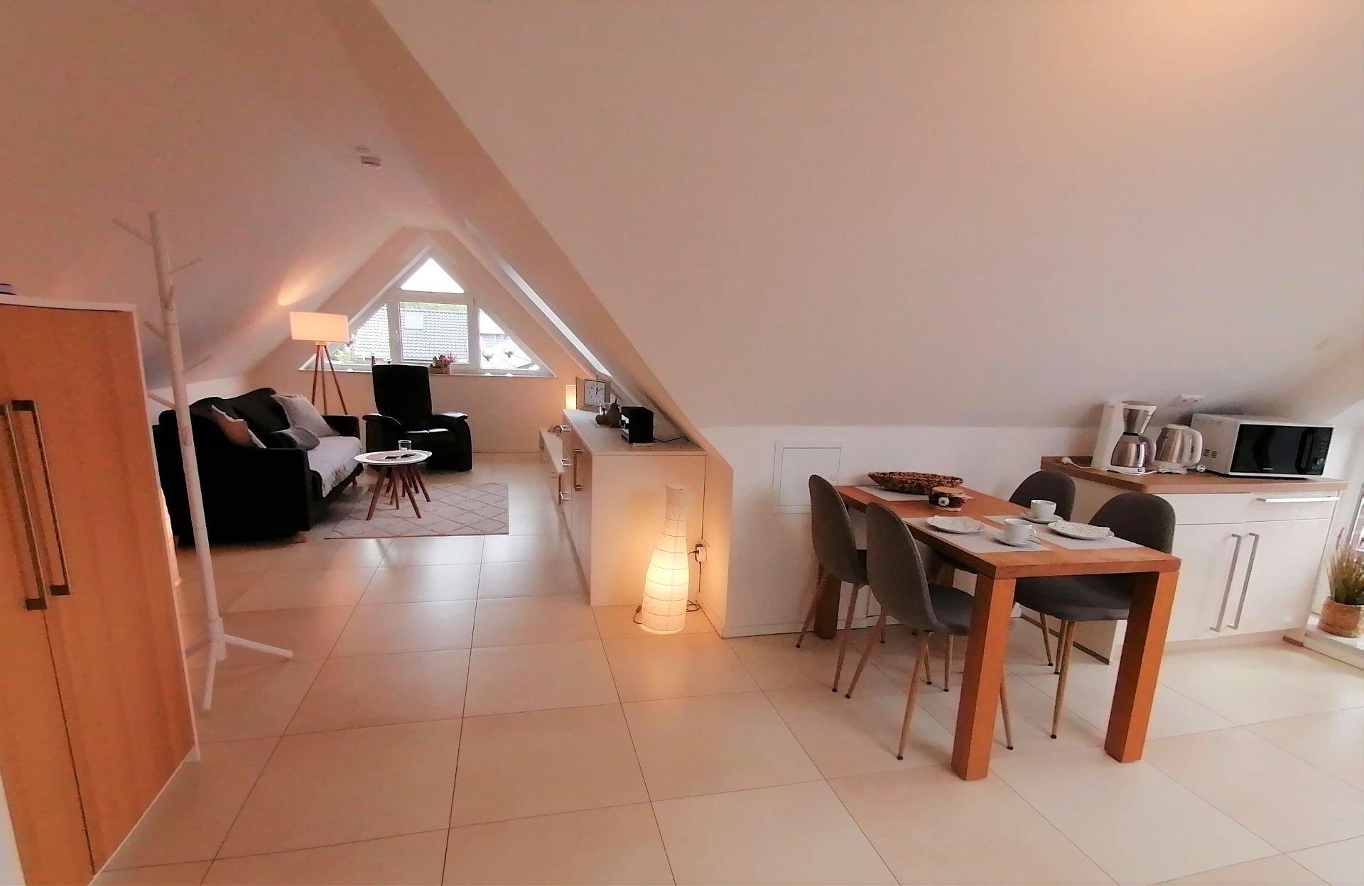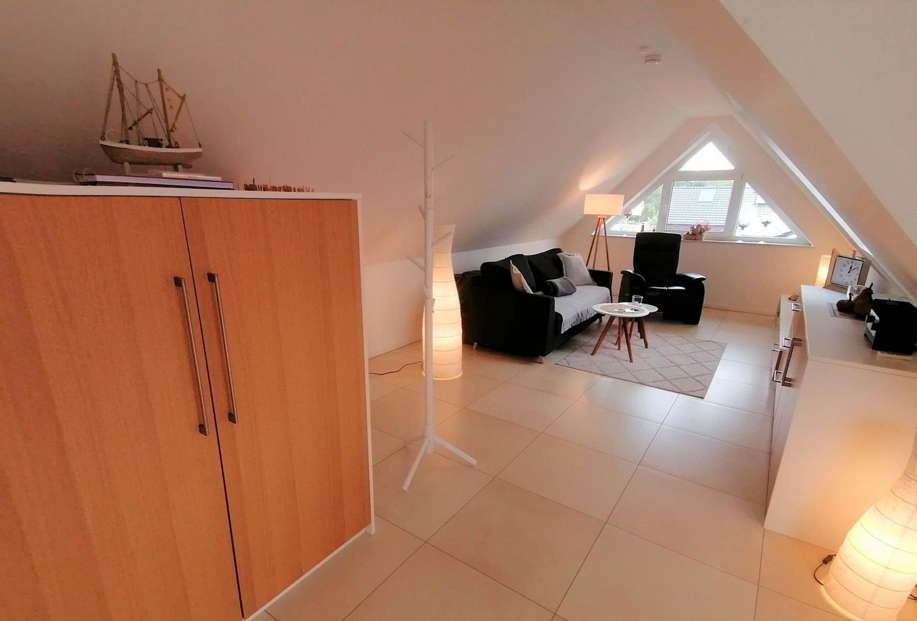 Gemütliche Ferienwohnung (52m²) im 2. OG mit BalkonDie lichtdurchflutete Ferienwohnung liegt in der zweiten Etage und wurde mit viel Geschmack eingerichtet.Zur Verfügung stehen Ihnen ein Wohnraum mit Küche, offenes Schlafzimmer und ein Tageslichtduschbad. Zum Entspannen steht auch ein Balkon (Südseite) zur Verfügung.Zum Wohnzimmerinventar gehören:40 Zoll LED FernseherDigitaler SAT-ReceiverBlu-ray /DVD-Player und FilmeTeufel SoundanlageSchlafsofa mit Topper (Liegefläche 160x200) und ein Relax SesselSpiele / BücherIm Wohnbereich steht ein Schrank mit Ganzkörperspiegel und Kleiderstange zum aufhängen von Kleidung zur Verfügung.Küche mit Essplatz :Kühlschrank mit GefrierfachMikrowelleElektroherd mit InduktionsfeldBackofenKaffeemaschineSenseo PadmaschineToasterWasserkocherGeschirrspülmaschineElektro-TischgrillDer Schlafzimmerbereich ist offen und nicht durch eine Tür vom Wohnbereich getrennt:1 Doppelbett (180x200 cm) mit getrennten Matratzen 2 große Kopfkissen (80x80 cm) und 2 schmale Kopfkissen (40x80 cm) zur AuswahlBettdecken für jede JahreszeitAblage am Bett mit LeseleuchtenWecker26 Zoll LCD FernseherSideboard mit großen Schubladen für KleidungIm Tageslicht-Duschbad befinden sich:WCFast ebenerdige DuscheHandtuchheizkörperFön und KosmetikspiegelFür die wärmeren Tage, steht ein transportables Klimagerät zur Verfügung. Die Dachfenster sind mit wärmeisolierenden Fliegenschutzgitter ausgestattet.1 Kfz-Stellplatz vor dem HausFahrradschuppen (abschließbar) und Auflade Möglichkeit für E-BikesDie Ferienwohnung liegt in der zweiten Etage, somit ist Treppensteigen erforderlichBei Anreise liegt eine Erstausstattung für Sie bereit.Bettwäsche und Handtücher können gerne gegen eine Gebühr zur Verfügung gestellt werden.Wäschepaket: Bettwäsche & Handtuchpaket (1 Duschtuch/2 Handtücher) pro Person 35,00 Euro.Der Kurbeitrag wird vor Anreise auf das Eigentümerkonto überwiesen.