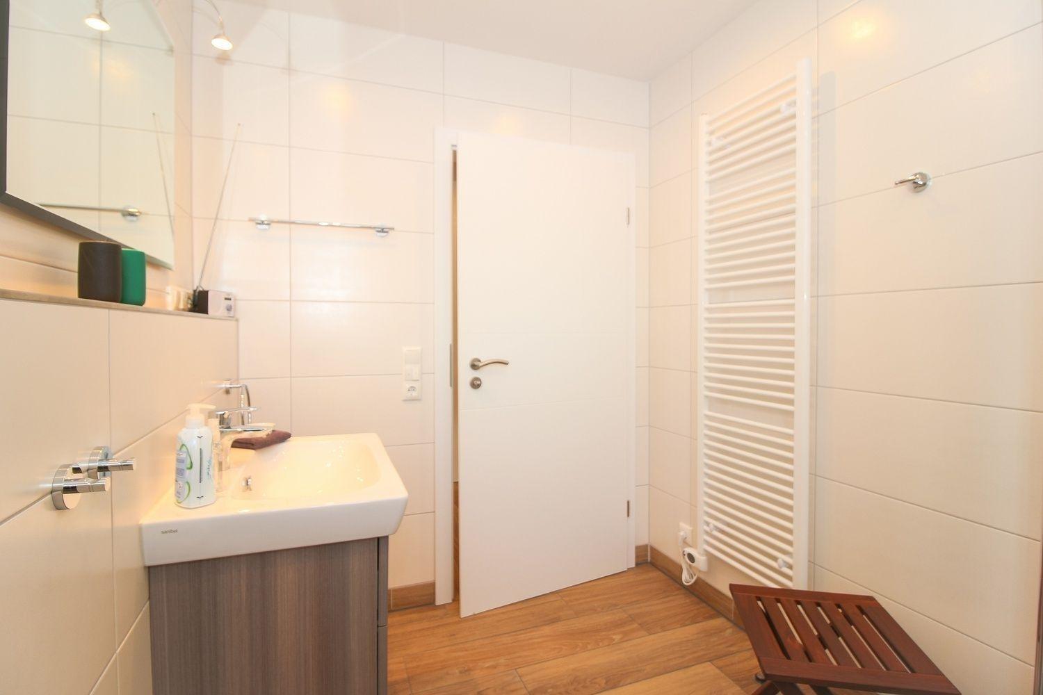 Im Bad befinden sich eine sehr große, bodentiefe Dusche, WC und Waschtisch mit Unterschrank - alles ist vorhanden. Der Handtuchwärmer schenkt an kalten Tagen warme Handtücher.