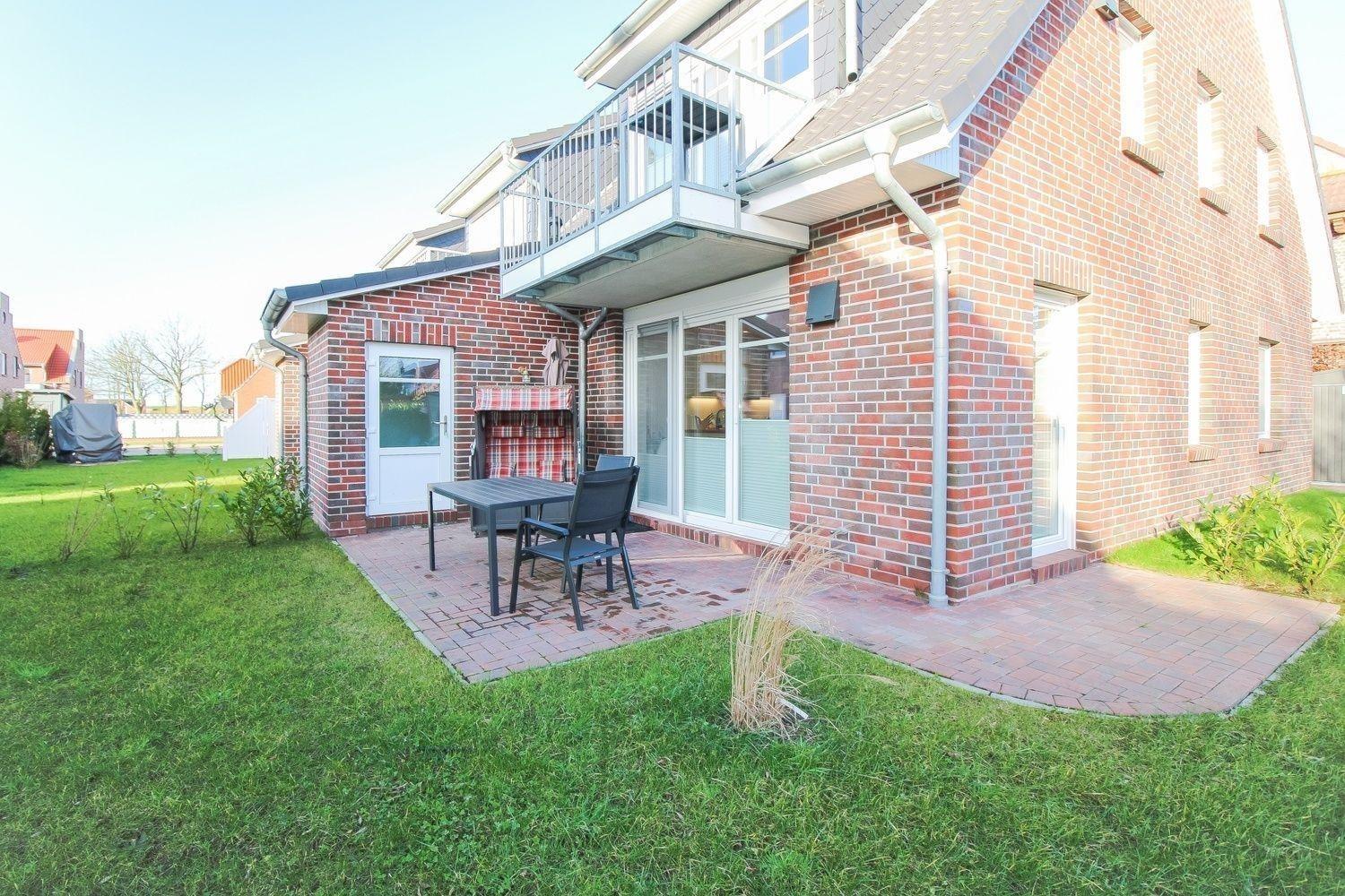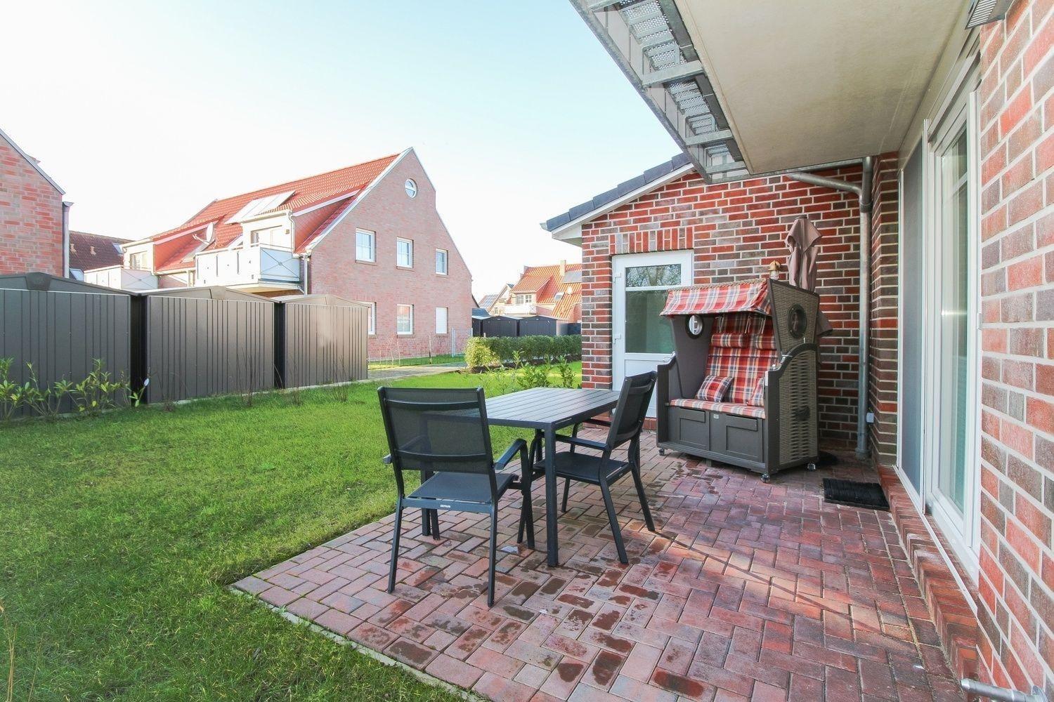 Der Terrasse am Haus, die sich vor den großen, lichtverwöhnten Fensterelementen befindet, schließt sich der Garten mit einer Rasenfläche an. Auf der Terrasse wartet ein gemütlicher Strandkorb auf Sie!
