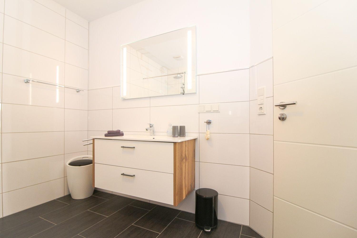 Das Badzimmer hat eine bodengleiche große Dusche und komfortable Badmöbel.