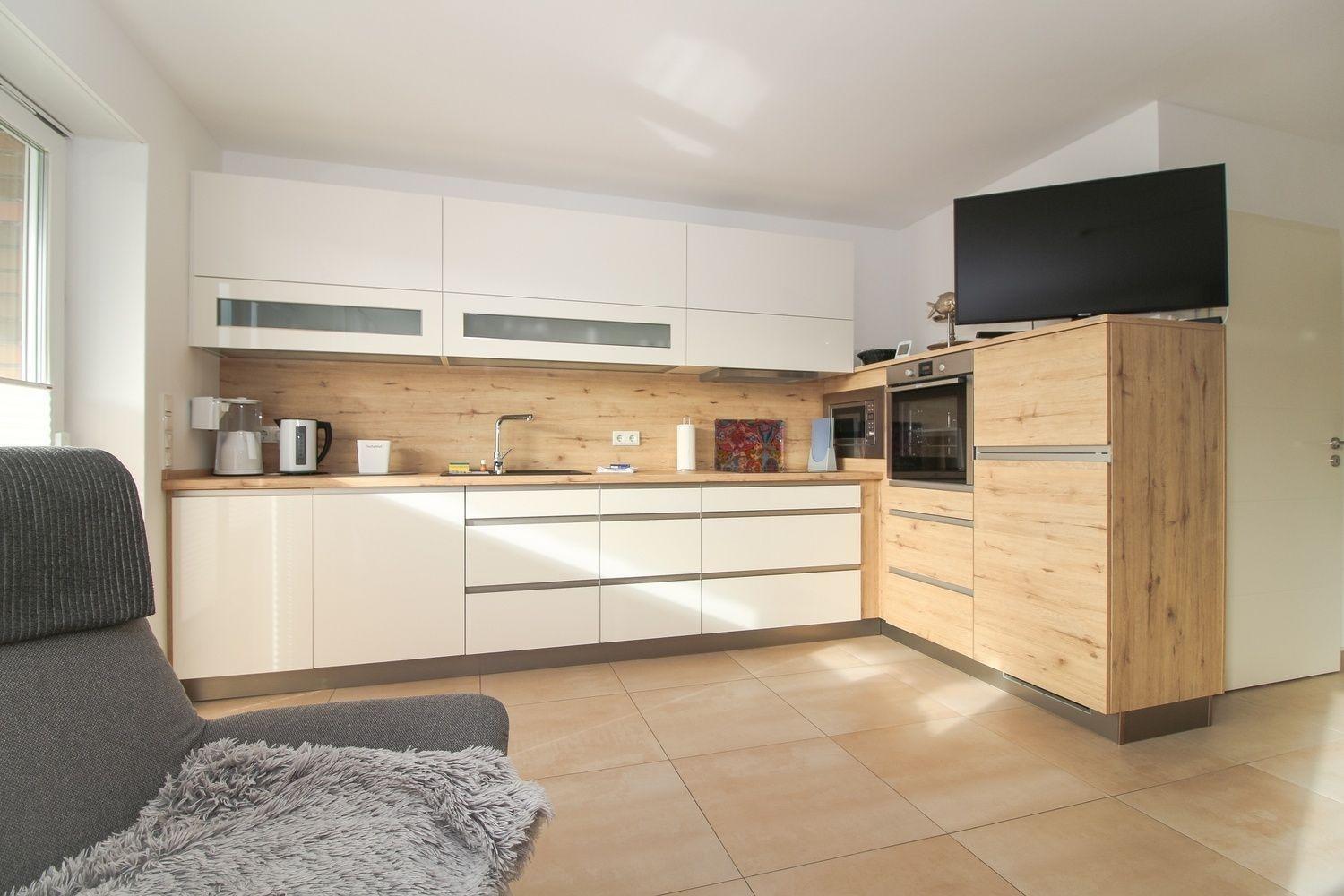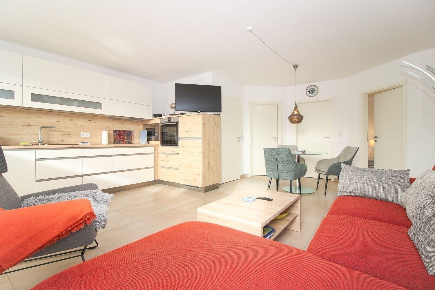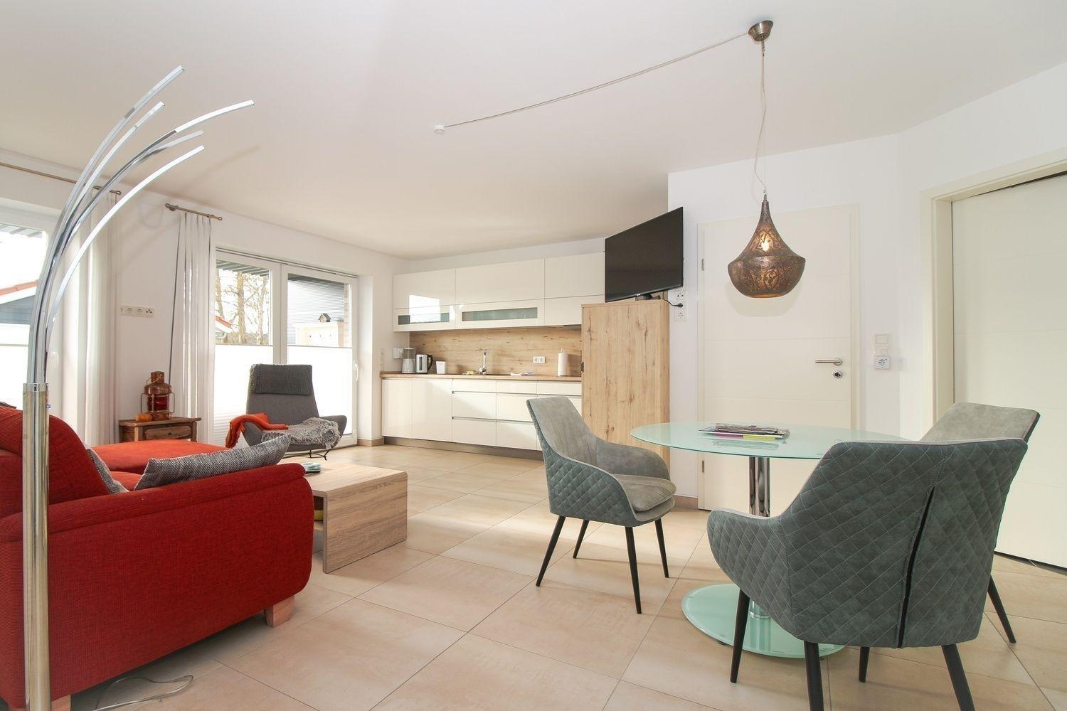 Die ebenerdige Ferienwohnung mit eigenem Hauseingang verfügt über ein sonnendurchflutetes Wohnzimmer mit einem großzügigen Essbereich und einer offenen, modernen Küche, die keine Wünsche offen lässt.