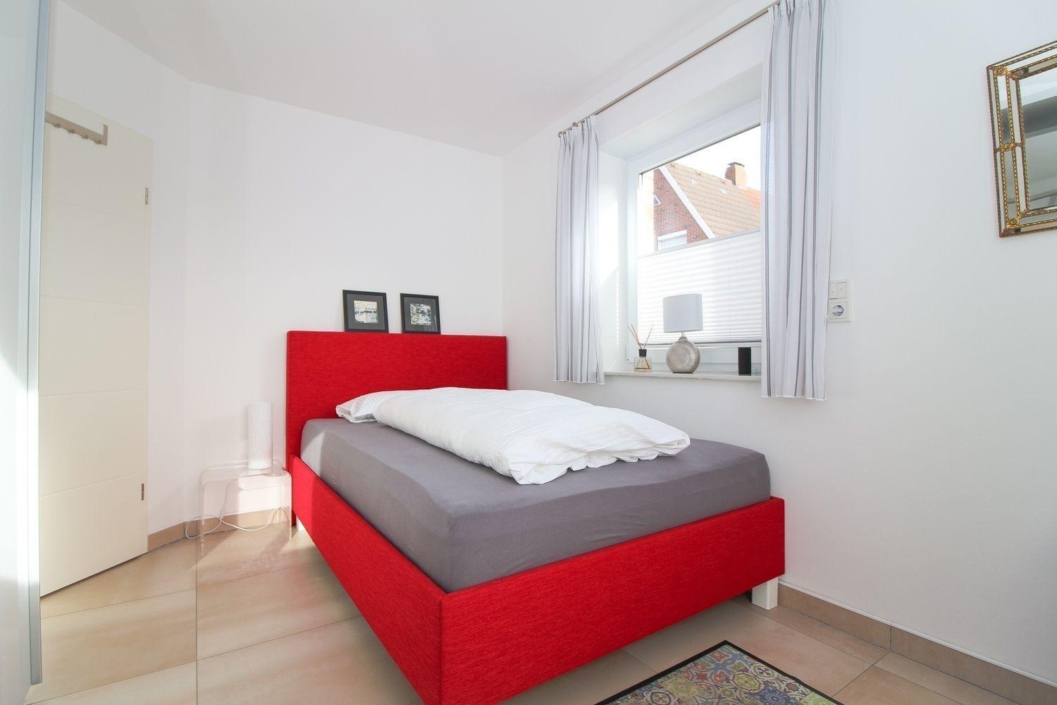 Das Schlafzimmer ist friesisch gemütlich mit einem komfortablem Doppelbett, Kleiderschrank, Kommode und Flachbildfernseher ausgestattet.