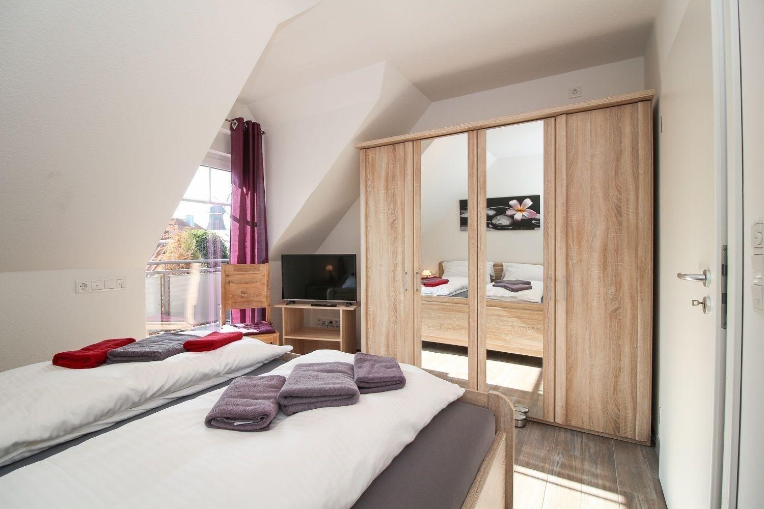 Die Wohnung verfügt über eine komplett eingerichtete, separate Küche mit sämtlichen Elektrogeräten (Spülmaschine, Waschmaschine, Nespresso-/Kaffeepad-/Filterkaffee-Maschine etc.), einem Wohn-/Essbereich, einem Schlafzimmer mit Doppelbett und einem Bad mit ebenerdiger Dusche. Im Dachgeschoss befindet sich ein weiteres Schlafzimmer mit zwei Einzelbetten (je 100x200cm). Außerdem ist ein zweites WC im Dachgeschoss vorhanden.