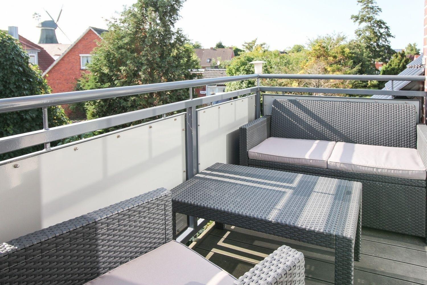 Ein Süd-Balkon mit Gartenstühlen/ -tisch, Sonnenschirm und Lounge Möbeln, der sowohl vom Schlafzimmer als auch vom Wohnzimmer betreten werden kann, und ein PKW-Stellplatz gehören zur Wohnung.