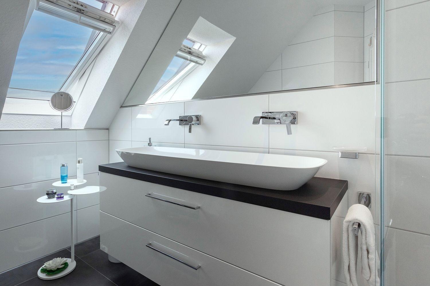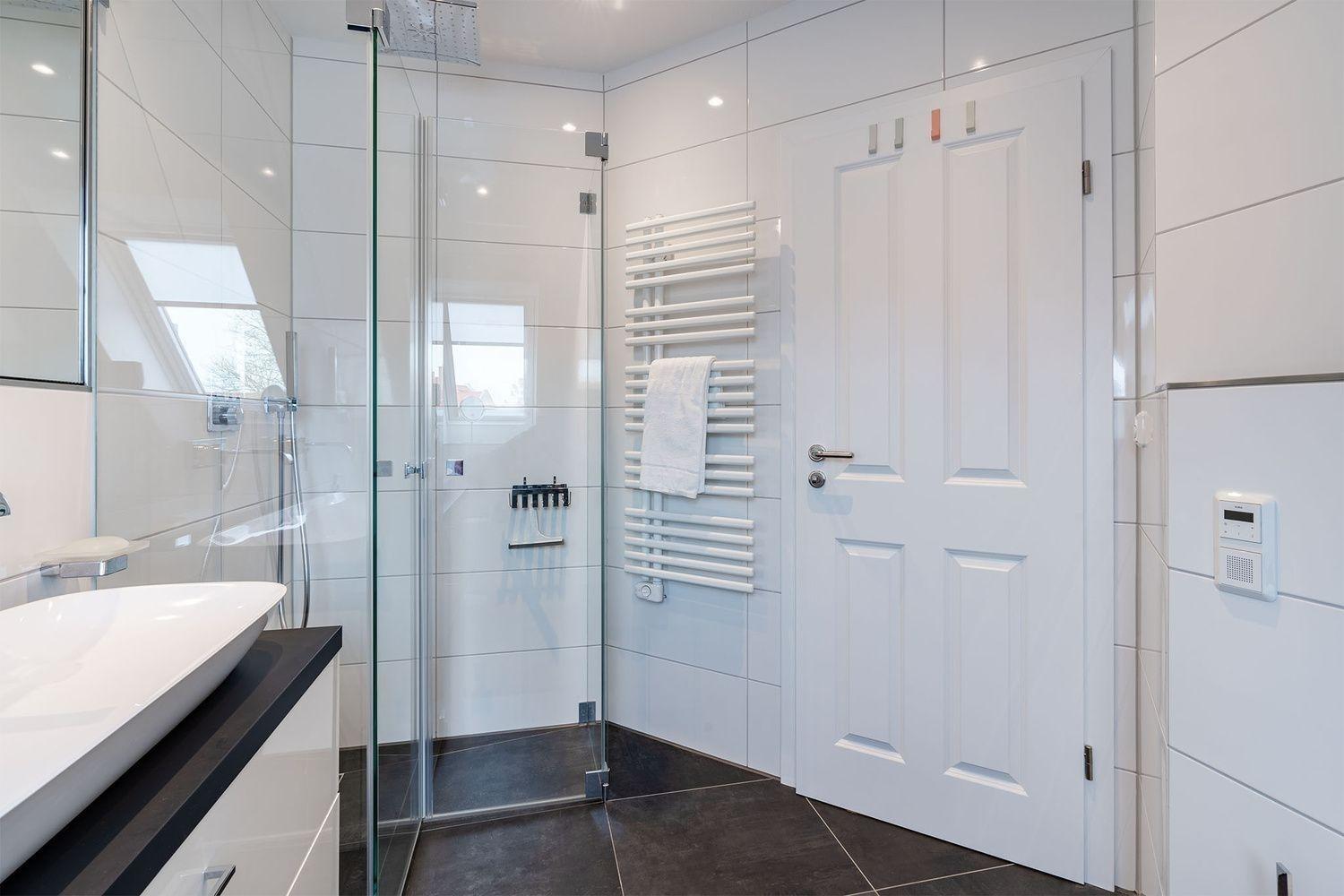 Das Bad mit rahmenloser Glasdusche in 100x100 cm, exklusivem Duschvergnügen mit Grohe Smart Control mit 2 strahliger Regendusche und Designhandbrause, einem Doppelwaschbecken, großer Spiegelwand, Handtuchheizkörper und Radio können Sie als kleine Wellnessoase nutzen.