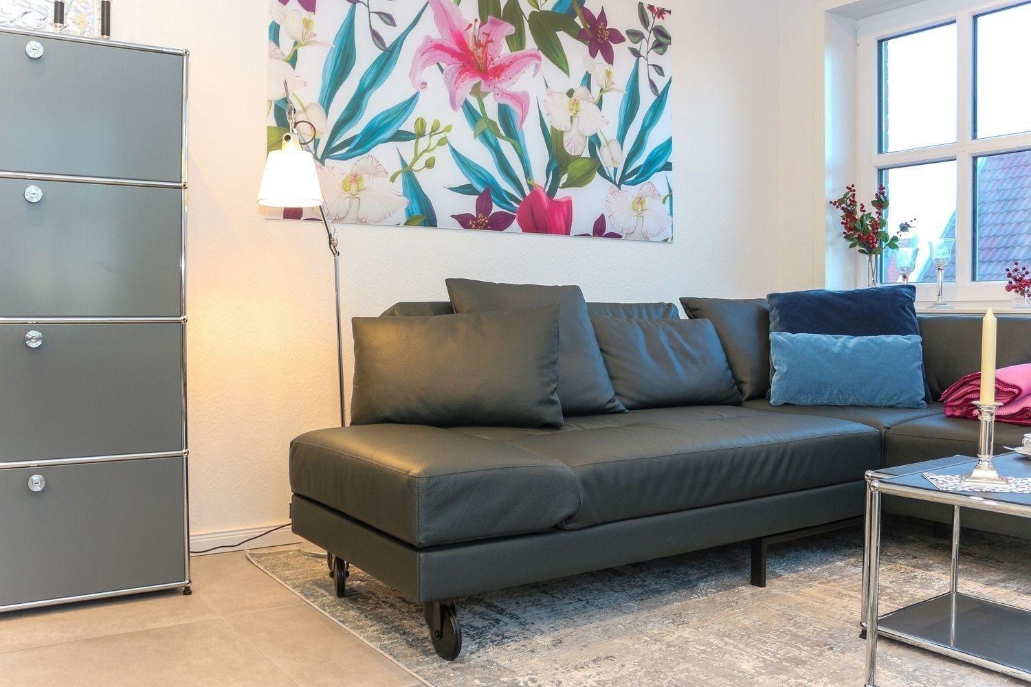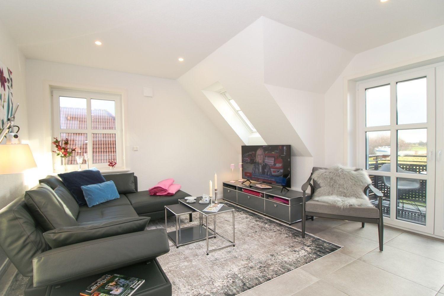Ein offener, lichtdurchfluteter Wohn-/Essbereich mit vollständig ausgestatteter integrierter Küche führt über eine große Fensterfront auf den Balkon mit Gartenmöbeln und elektrischer Markise. Zur Unterhaltung steht ein Samsung Fernseher 55 Zoll, ein Blu-ray Disc Player und ein Teufel Premium-Digitalradio mit 1000 plus Radiosendern zur Verfügung.