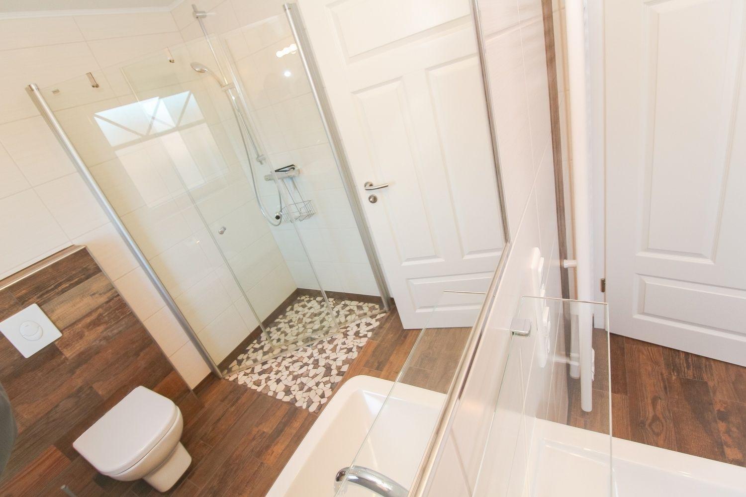 Das Badezimmer hat eine ebenerdige Dusche mit Ganzglastüren und Handtuchheizkörper sowie Fußbodenerwärmung.