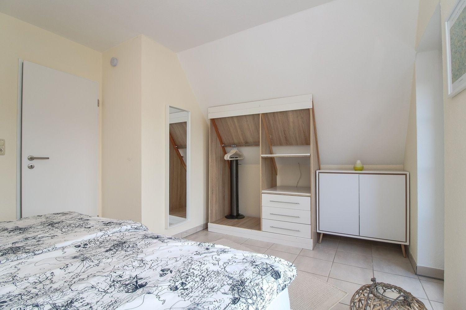 Über eine normale, gut begehbare halb gewendelte Treppe gelangst du zu den beiden gemütlichen Schlafzimmern. Eines der Schlafzimmer verfügt über einen Balkon, ausgestattet mit einem kleinen Tisch und zwei Stühlen. Das komfortable Doppelbett misst 180x200 cm. Im zweiten Schlafzimmer stehen dir zwei Einzelbetten (je 90x200 cm) zur Verfügung. Zwischen den Schlafzimmern befindet sich ein schönes Badezimmer mit Dusche.