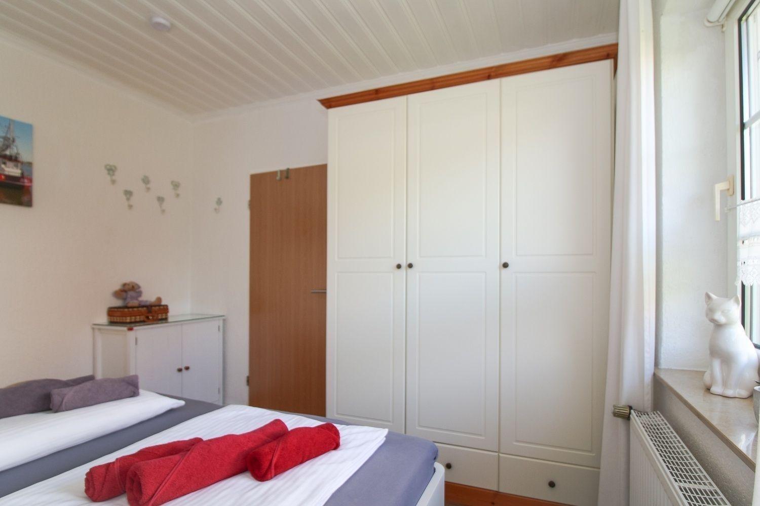 Es gibt ein größeres Schlafzimmer mit Schrank und Doppelbett. Ein zweites kleineres Schlafzimmer kann von einer weiteren erwachsenen Person genutzt werden.