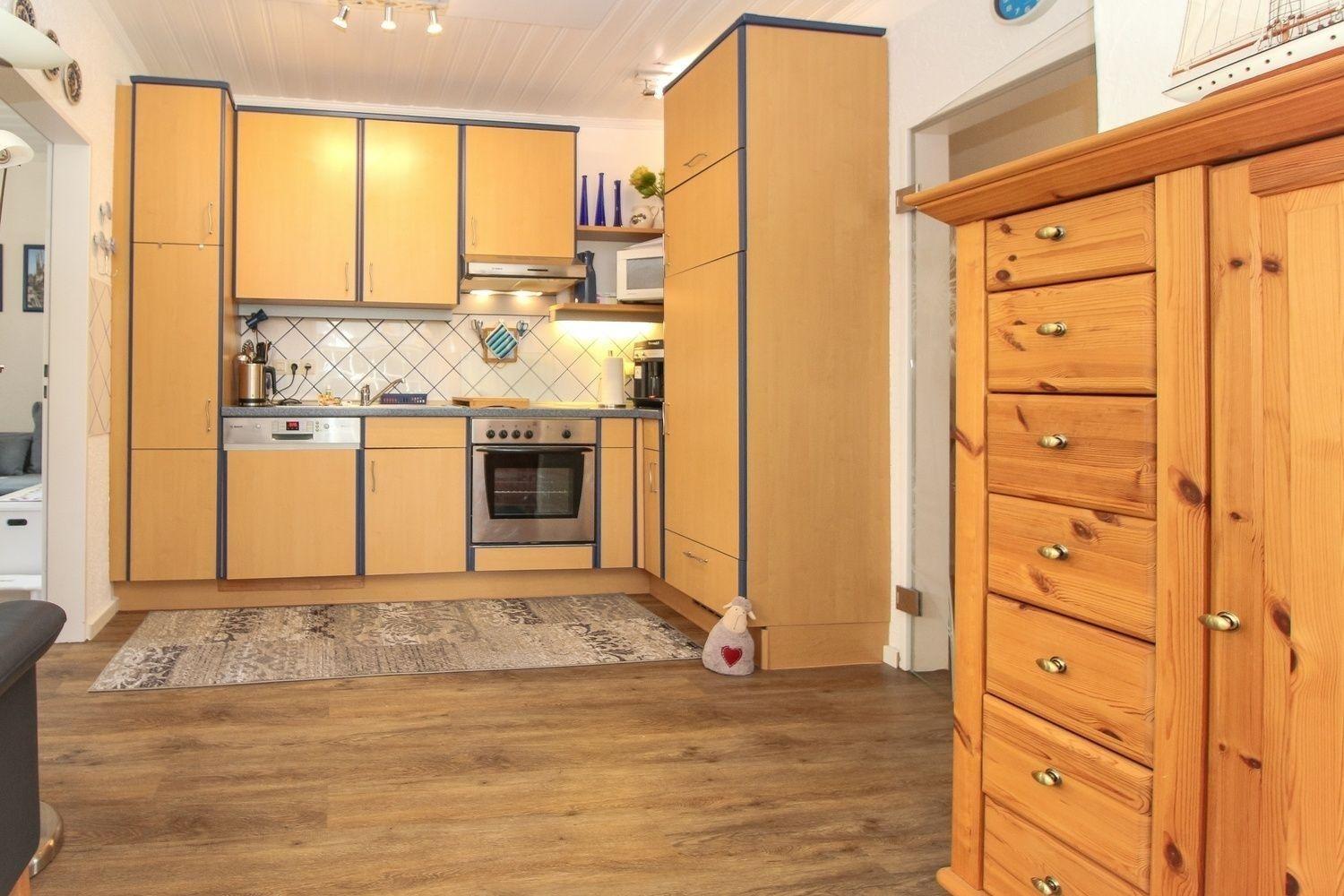 Der Wohn- Essbereich ist sehr gemütlich und ansprechend eingerichtet, Stressless-Sitzmöbel und Vollholzmöbel, sowie mit allem notwendigen Zubehör ausgestattet. Großer Fernseher (SAT), Musikanlage/CD und WLAN sind selbstverständlich. Die integrierte Küche verfügt über alle notwendigen Elektrogeräte und natürlich auch über einen Geschirrspüler. Vom großzügigen hellen Wohnbereich haben Sie direkten Zugang auf die Terrasse (mit Markise) und den, die ganze Wohnung umgebenden Gartenbereich mit bequemen Gartenmöbeln sowie einem Strandkorb.