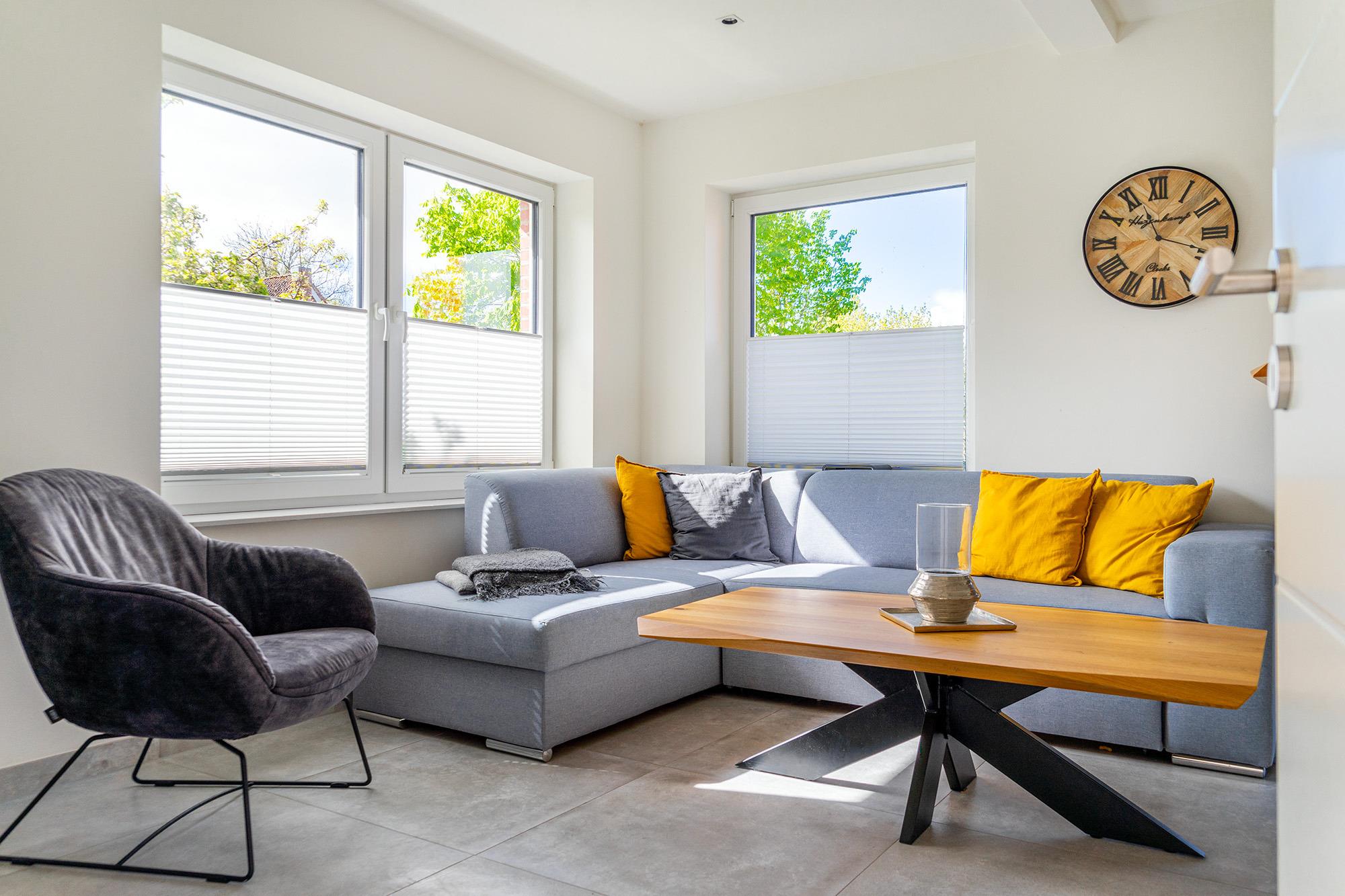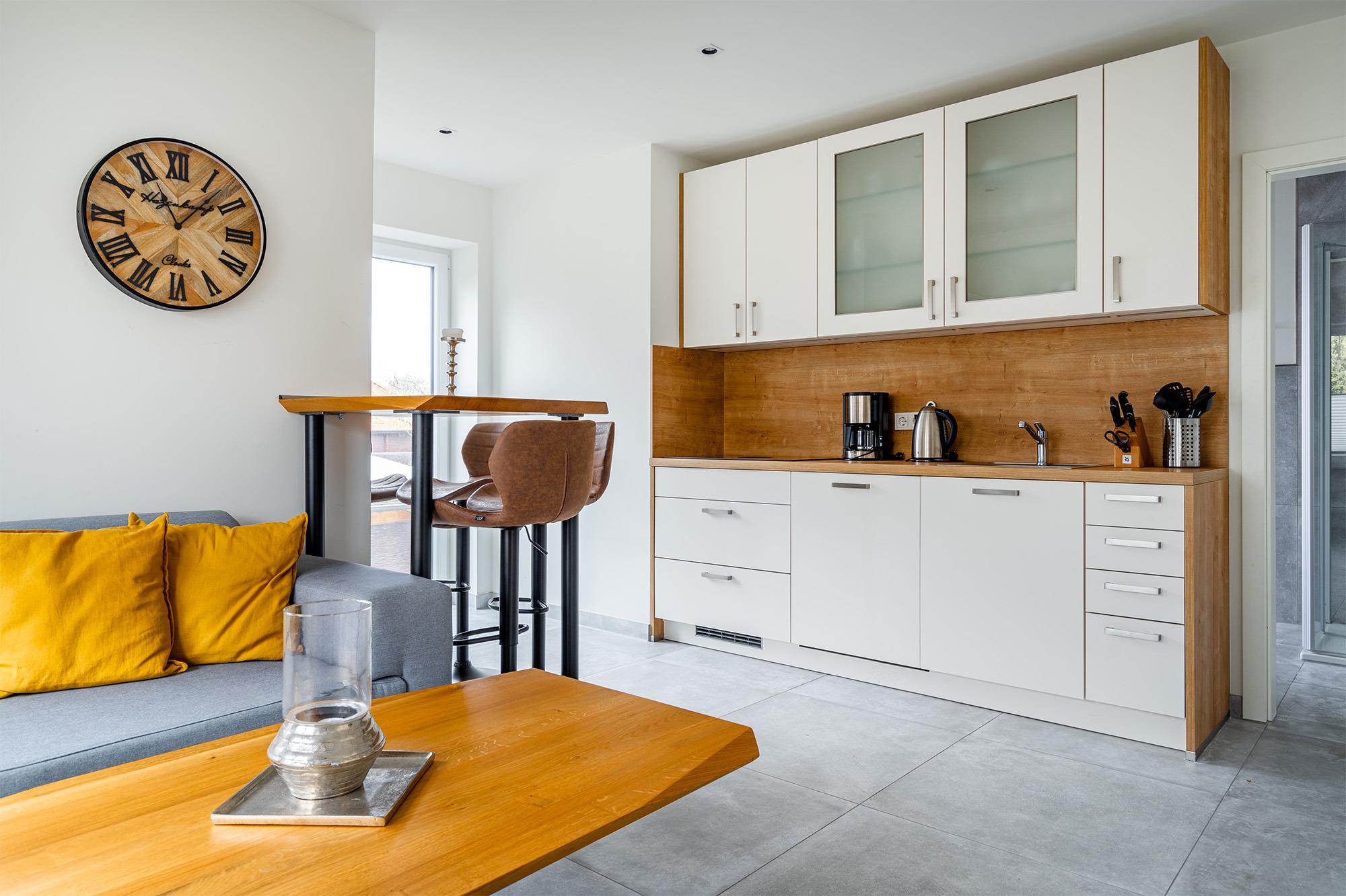 Unsere Wohnung "Die Zimmerei 2" bietet sich mit ihren etwa 70qm als perfektes Urlaubsdomizil an. Sehr zentral und dennoch ruhig in einer durchfahrtsbeschränkten Straße gelegen bietet sie einen hellen und modernen Wohn-Ess-Bereich mit einer großzügigen und voll ausgestatteten Küchenzeile, sowie einen Esstisch (Hochtisch). Sie finden außerdem zwei Schlafzimmer mit bequemen und hochwertigen Boxpspringbetten sowie ein geräumiges Tageslichtbad. Auch ein Abstellraum mit einem Waschtrockner ist vorhanden. Trotz der Lage im Obergeschoss bietet die Wohnung außerdem eine Sonnenterrasse, die sie über den Hauseingang und eine Treppe im Garten erreichen. Selbstverständlich steht Ihnen ein eigener Parkplatz am Haus zur Verfügung. Sollten Sie mit einem E-Auto anreisen, verfügt das Objekt auch über eine Ladesäule, die Sie hinzu buchen können.