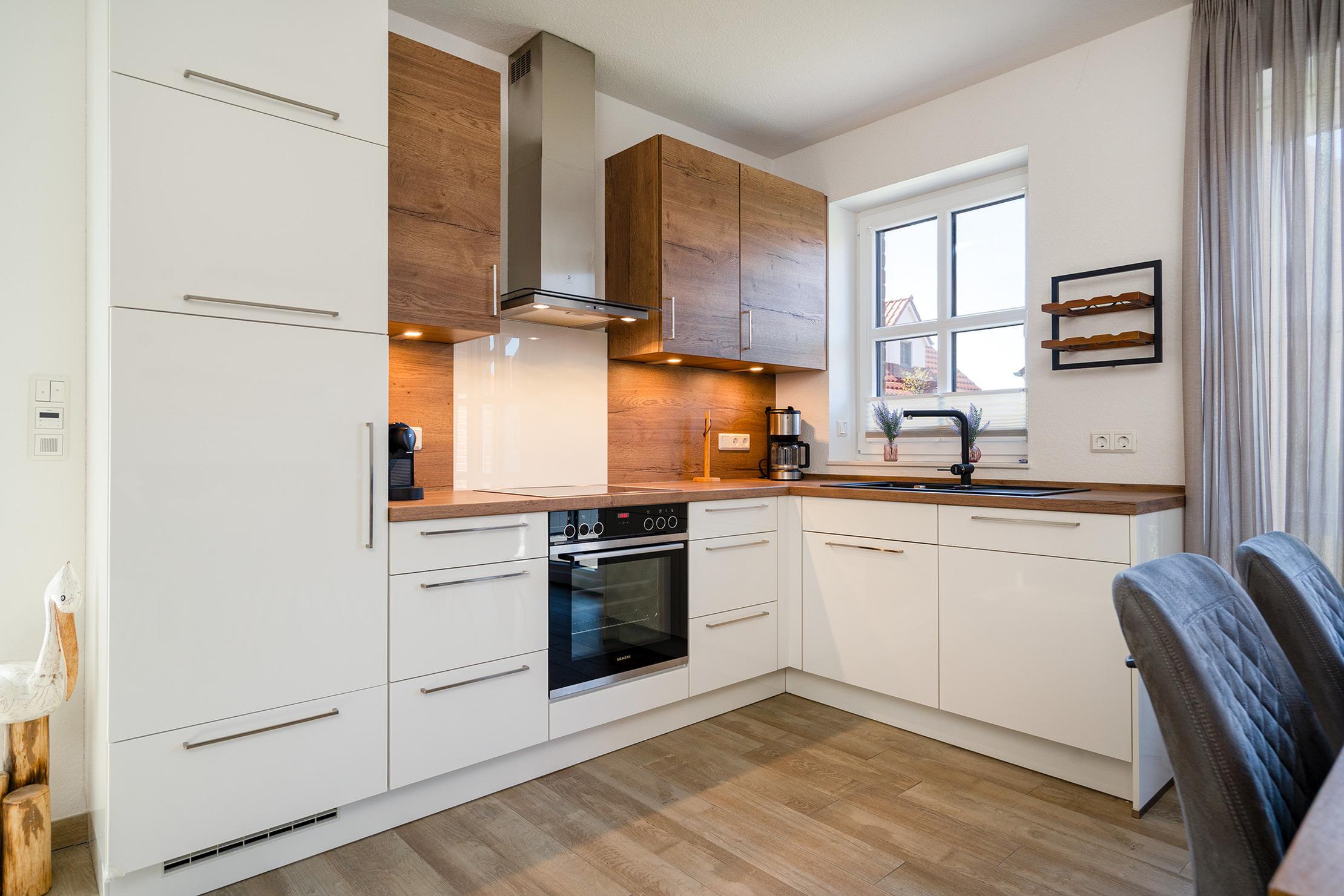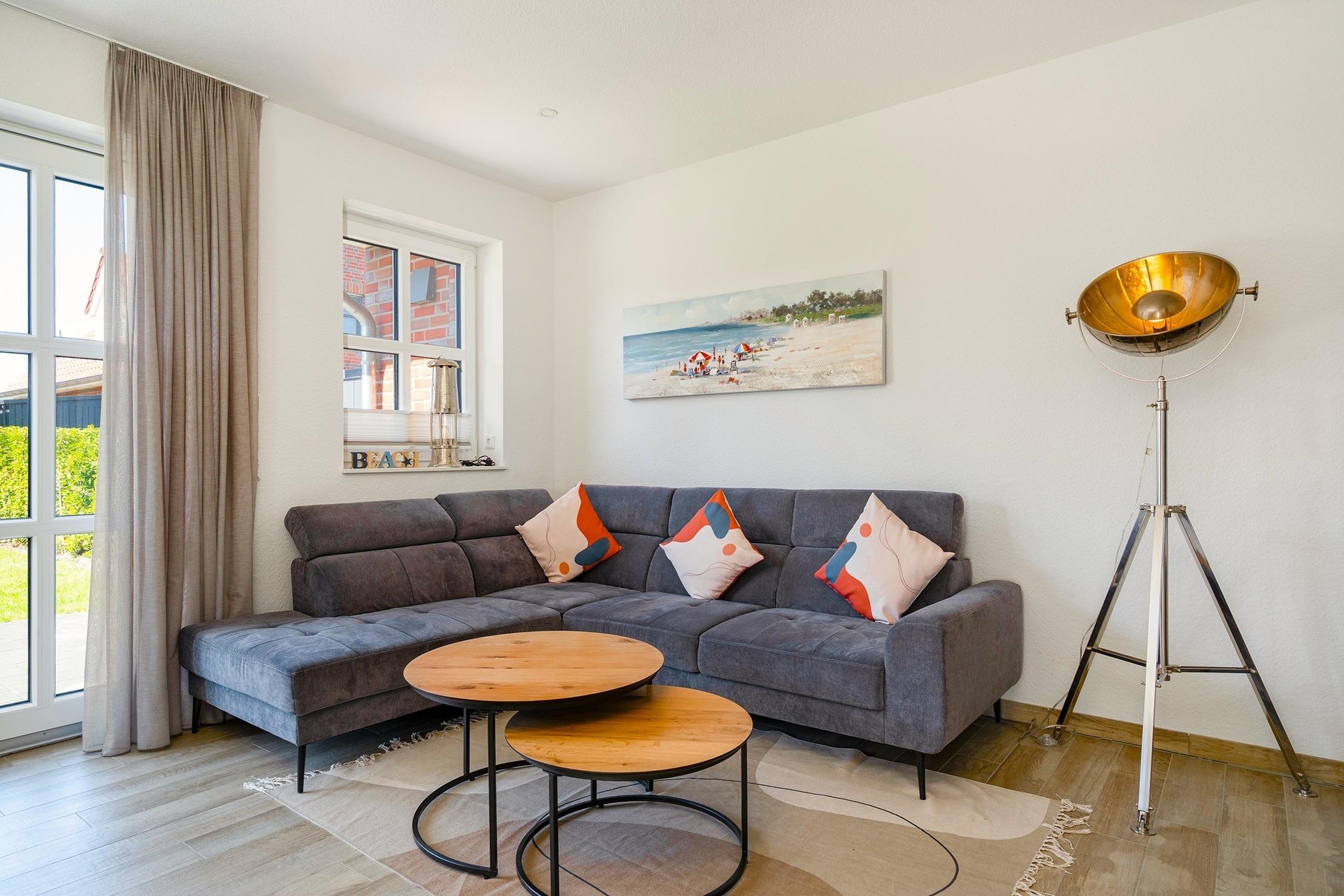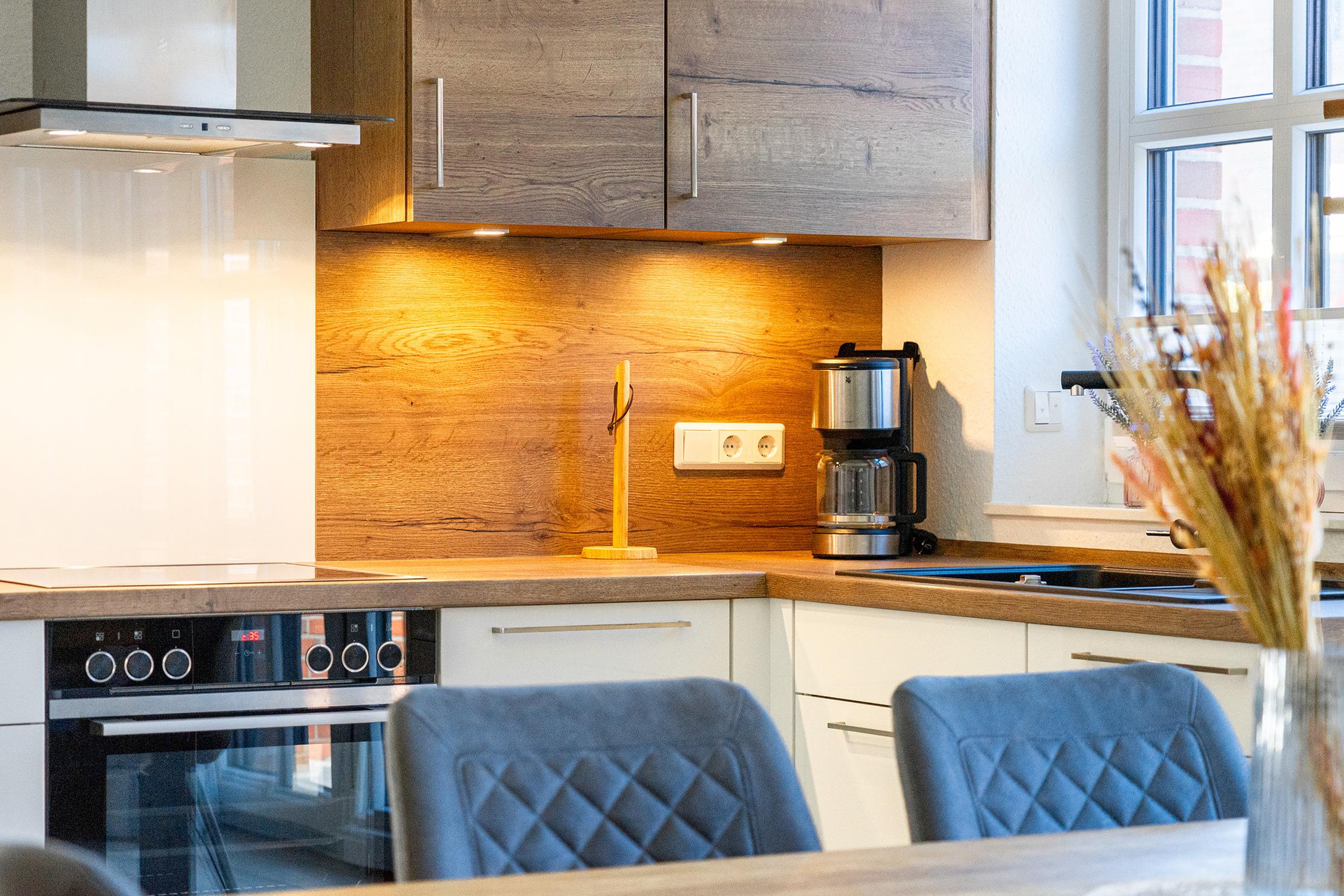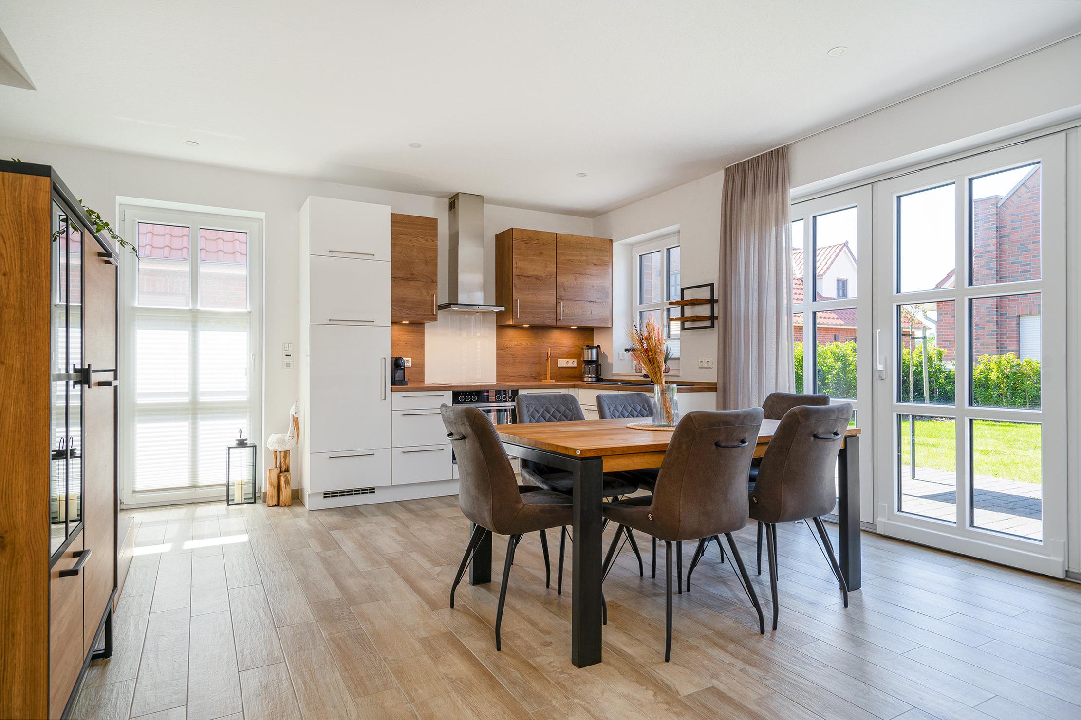 Unser Ferienhaus "Leni" liegt in idyllischer und ruhiger Lage am Feldrand in Greetsiel. Auf etwa 100qm bietet es ausreichend Platz für Familien, Freunde oder Paare, die gemeinsam Erholung suchen. Hierfür eignen sich die drei gemütlich eingerichteten Schlafzimmer, wovon sich eines im Erdgeschoss und zwei im Obergeschoss befinden. Besonders komfortabel sind außerdem die zwei vorhandenen Tageslichtbäder, die sich ebenfalls auf beide Etagen verteilen. Der helle und offene Wohnbereich bietet eine voll ausgestattete und hochwertige Einbauküche, einen großen Esstisch und eine einladende Sofalandschaft, sodass genügend Platz für gesellige Stunden vorhanden ist. Von hier aus haben Sie Zugang zum großen eingezäunten Garten, der ein besonderes Highlight des Hauses ist. Auf der möbilierten Terrasse mit Markise lassen sich entspannte Stunden bei frischer Nordseeluft genießen. Neben einem Fahrradabstellraum steht Ihnen selbstverständlich ein eigener PKW-Stellplatz zur Verfügung.