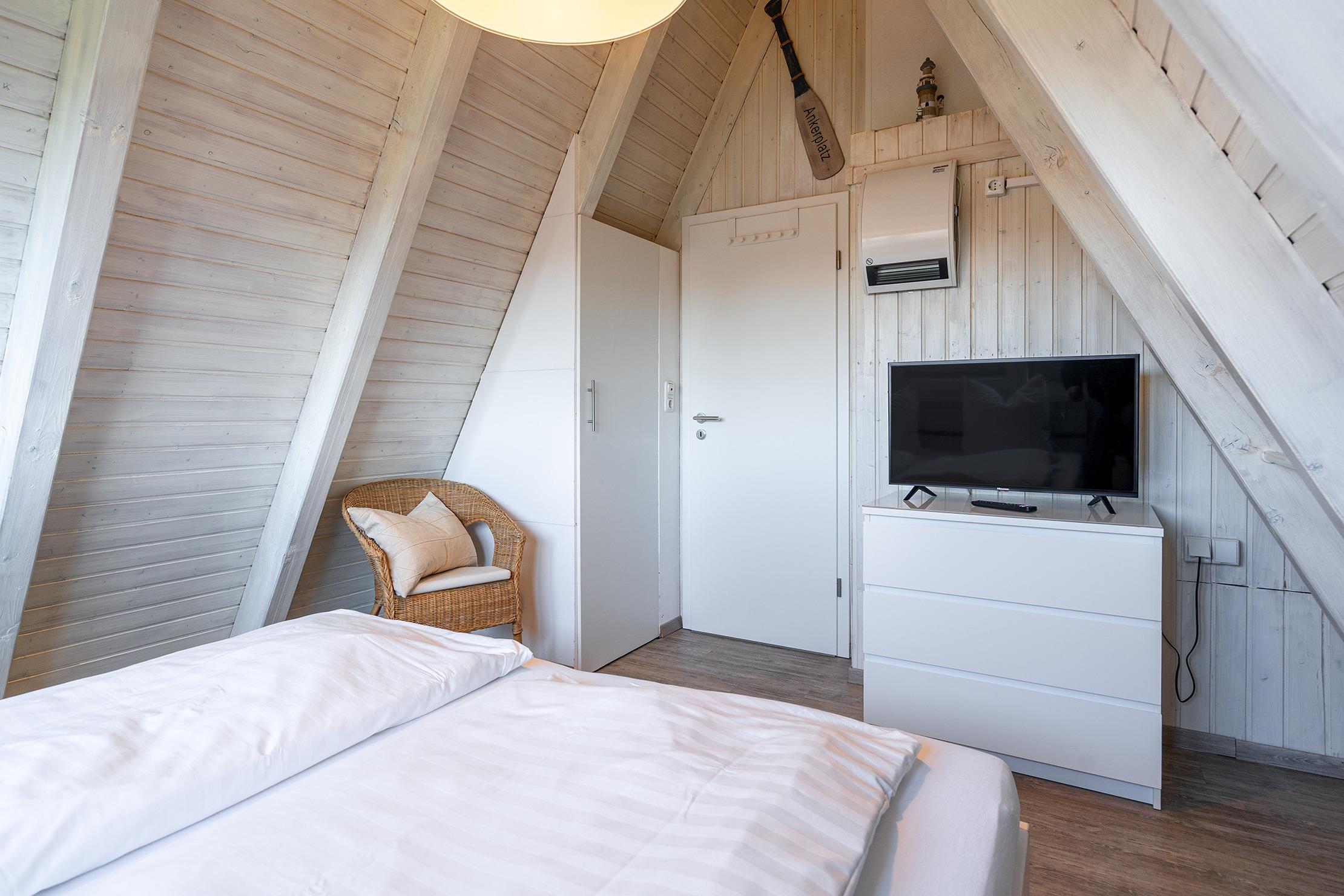 Das charmante Nurdach-Ferienhaus "Spitzhus" bietet auf 60qm eine gemütliche Unterkunft für erholsame Tage an der Nordseeküste. Das Haus besticht durch seine besondere Architektur und seinen einladenden und modernen Wohnbereich mit Sofa und Lesesessel im Erdgeschoss. Zur entspannten Atmosphäre trägt besonders der Gaskamin bei. Sie finden hier im Erdgeschoss außerdem eine voll ausgestattete Einbauküche, sowie ein helles Tageslichtbad, das alles bietet, was man für den täglichen Komfort benötigt. Im Obergeschoss befinden sich zwei Schlafzimmer, eines mit Doppelbett und eines mit zwei Einzelbetten, die ausreichend Platz für bis zu vier Personen bieten. Ein weiteres Highlight dieses Ferienhauses ist der große eingezäunte Garten mit Holzterrasse und Markise, in dem Sie die norddeutsche Luft in vollen Zügen genießen können. Ein reservierter Parkplatz gehört selbstverständlich auch zur Ausstattung des Hauses, ebenso eine Ladesäule für E-Autos.