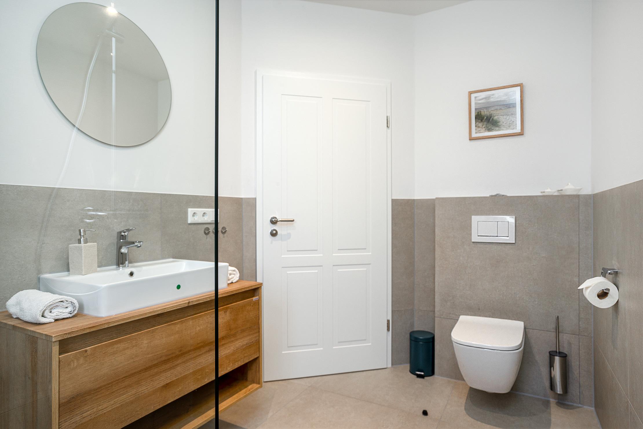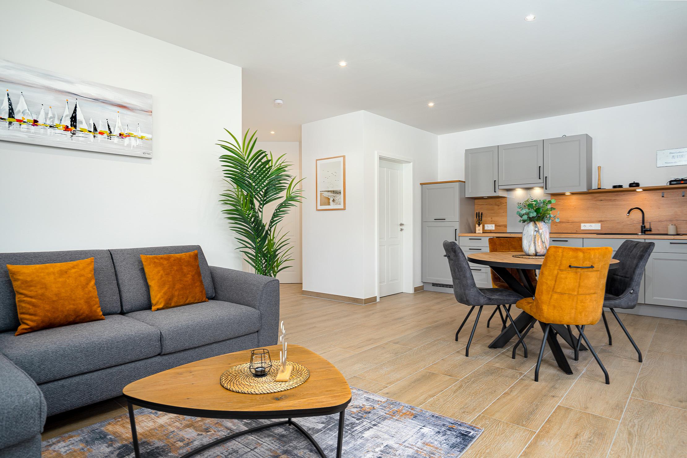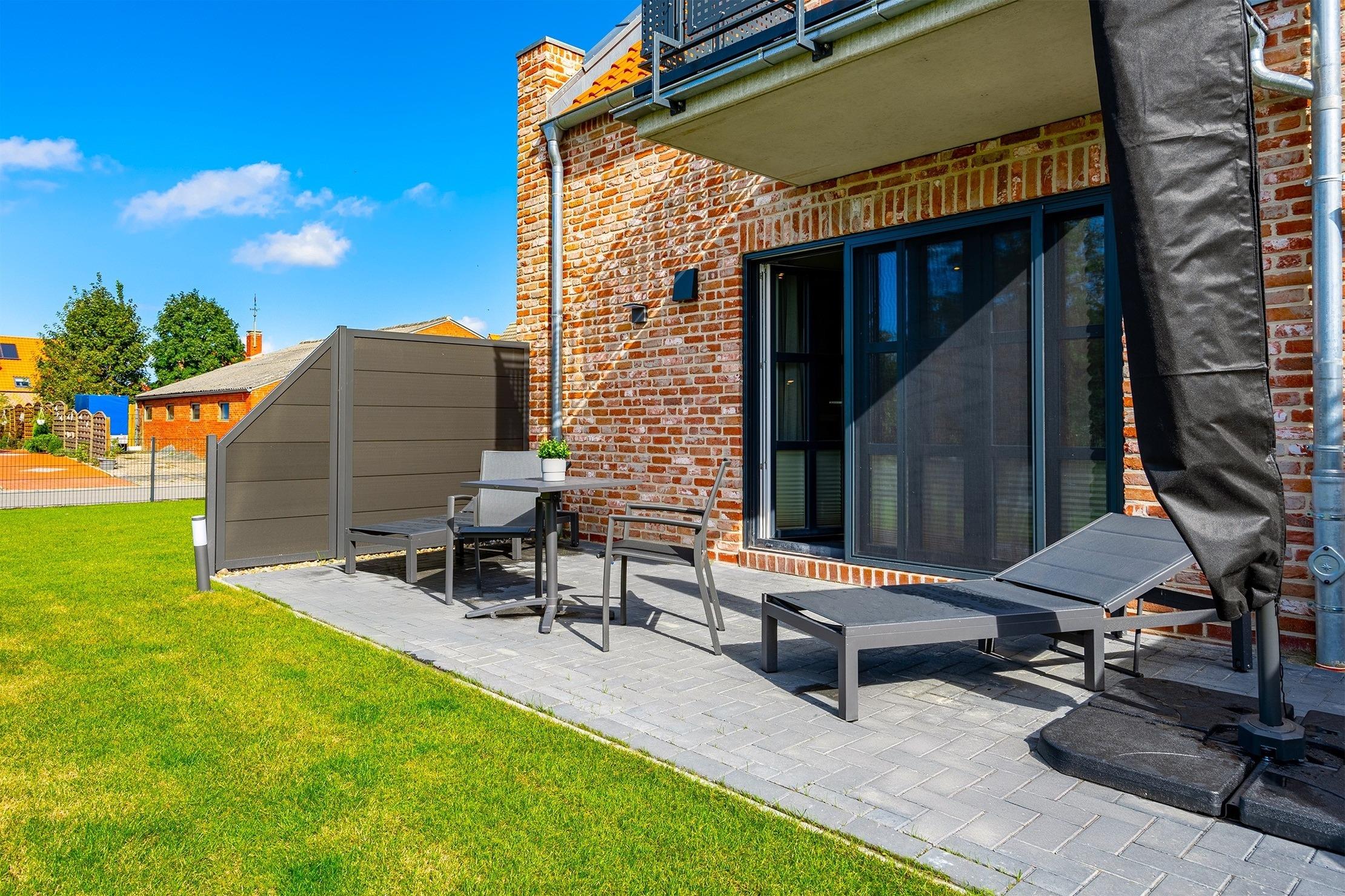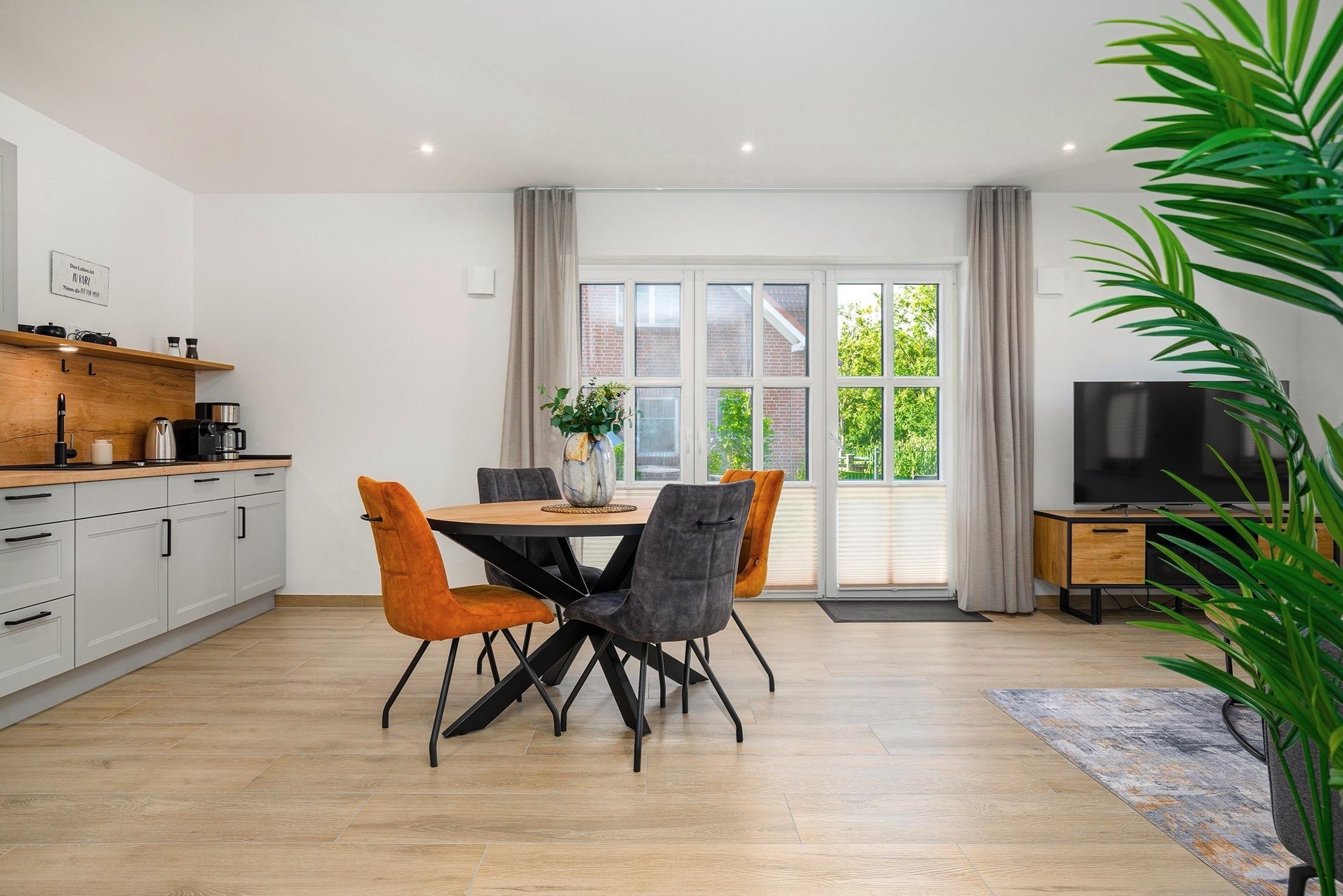 Unsere neue Ferienwohnung „Vista 11“ bietet auf 60qm alles, was man für einen entspannten Urlaub braucht. Im Erdgeschoss gelegen, besticht die Wohnung durch einen modernen und hellen Wohn-Ess-Bereich, der viel Platz zum Wohlfühlen bietet. Die hochwertige Einbauküche ist voll ausgestattet und lässt keine Wünsche offen. Das separate Schlafzimmer ist gemütlich und mit einem komfortablen Boxspringbett ausgestattet. Ein Highlight der Wohnung ist das Tageslichtbad, das mit einer ebenerdigen Dusche überzeugt und ein angenehmes Ambiente schafft. Der großzügige, eingezäunte Garten mit einer einladenden möbilierten Terrasse bietet viel Raum zum Entspannen und Genießen. Hunde sind in unserer „Vista 11“ herzlich willkommen, sodass auch Vierbeiner die Auszeit im Grünen genießen können. Neben einem Fahrradabstellraum steht selbstverständlich auch ein reservierter Parkplatz zur Verfügung.