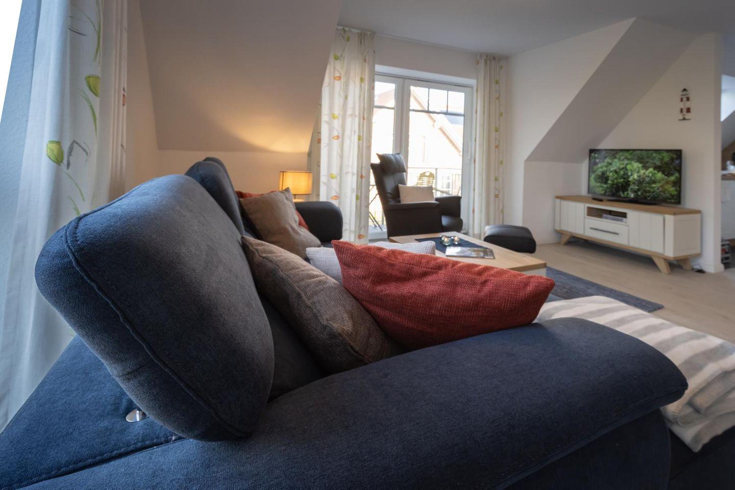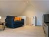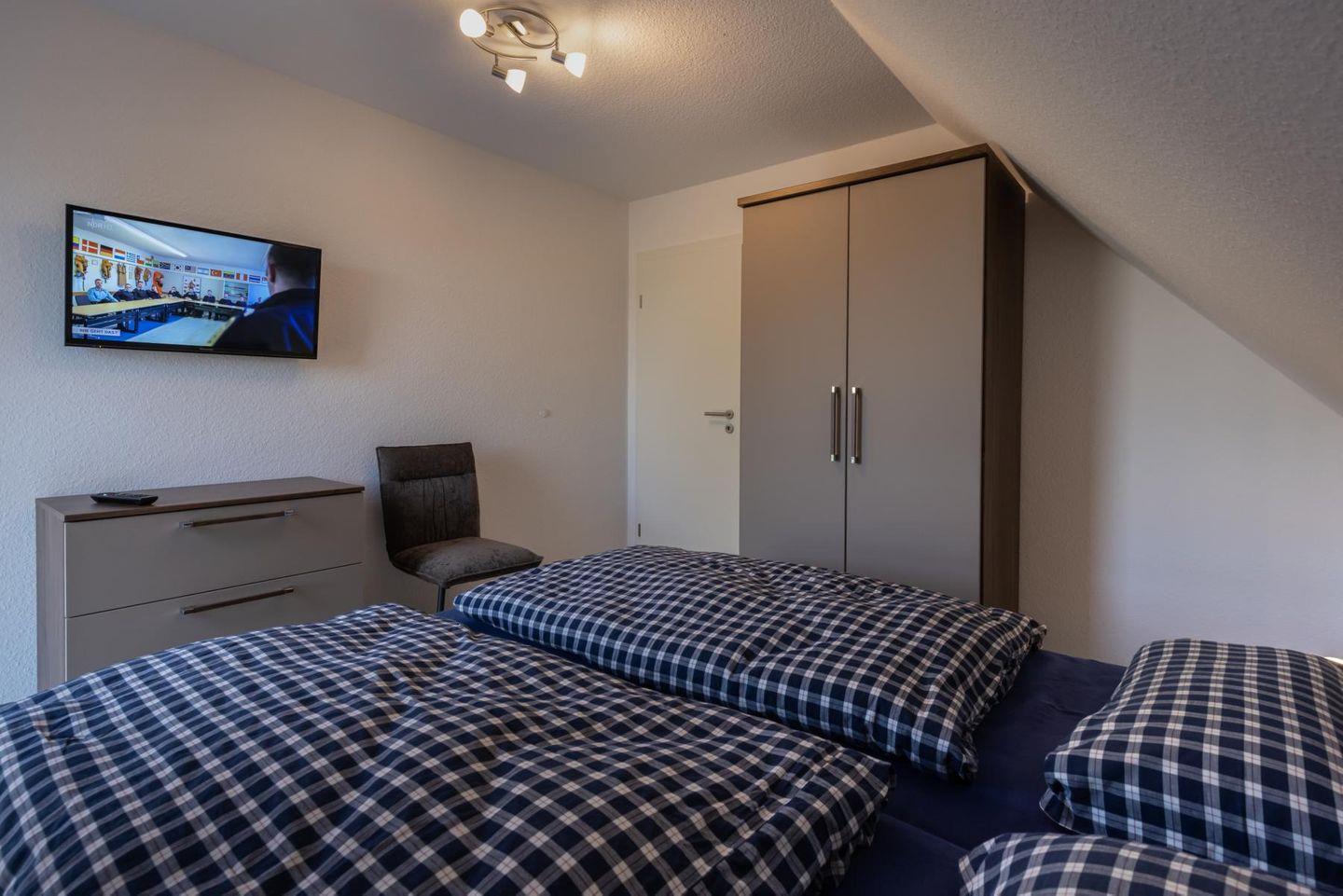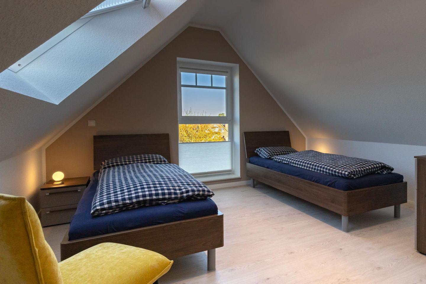 Das Dachgeschoss erreicht Ihr über eine Treppe aus dem Wohnbereich. Hier befindet sich ein weiterer, kleinerer Wohnbereich mit eigenem HD-TV sowie das einem zweite Schlafzimmer mit zwei Einzelbetten und Schränken.