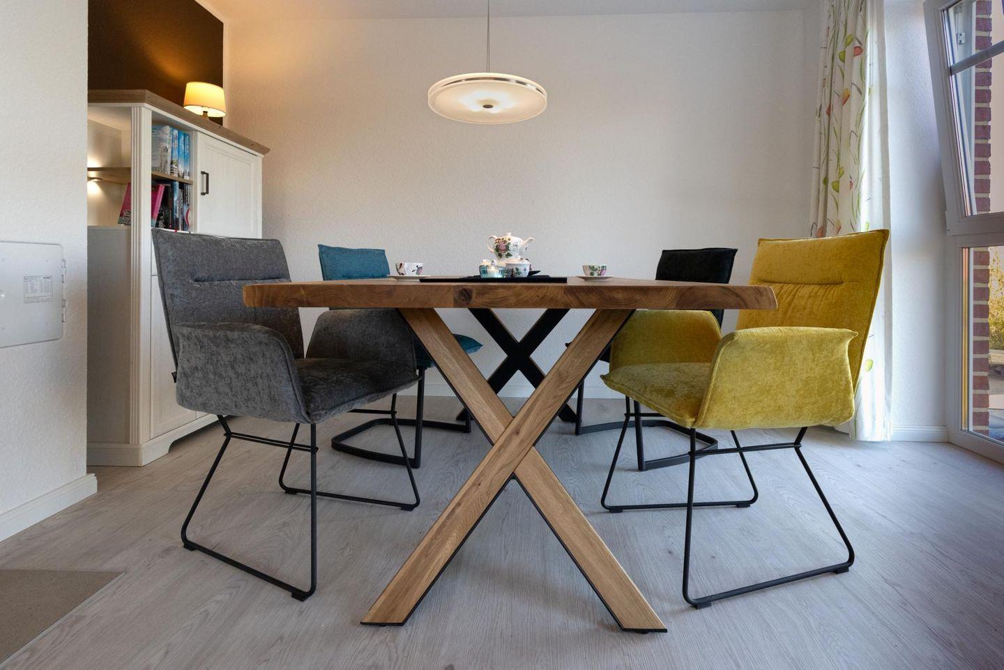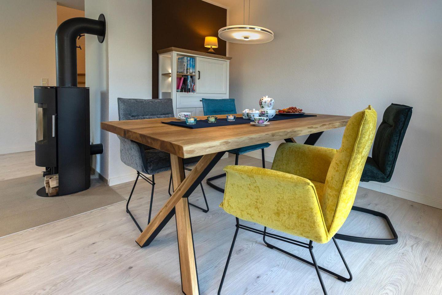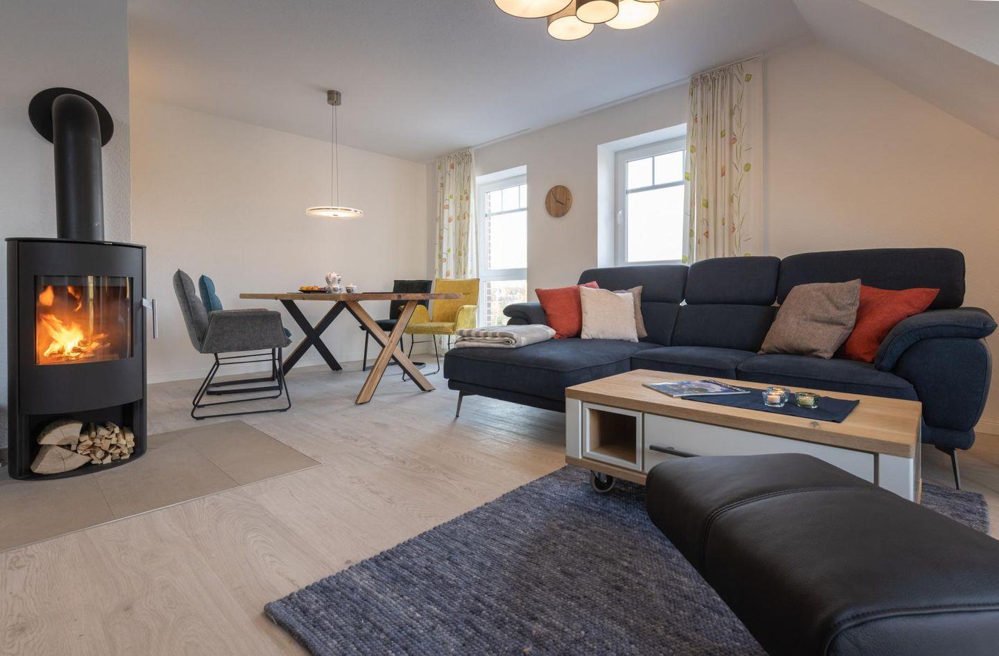 Unsere neue OG-Ferienwohnung „binnen un´ buten“ mit Balkon und Wasserblick liegt im 2021 erbauten Grachtenpark. Im hellen Wohn- und Essbereich mit einladender Sofaecke und einem gemütlichen Ledersessel mit Hocker fühlt man sich gleich wohl. Neben einem Fernseher findet Ihr hier eine kleine Auswahl an Lesestoff sowie Gesellschaftsspiele. Der zentrale Kamin zaubert besonders in der kalten Jahreszeit zusätzlich einen wohligen Charakter in die Wohnung.