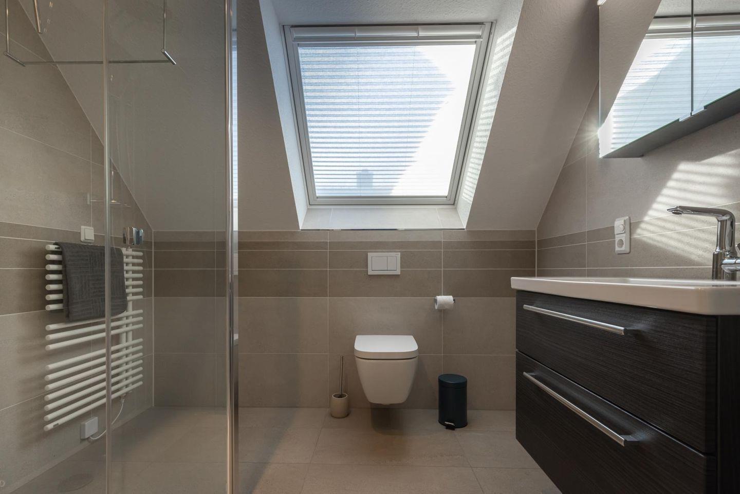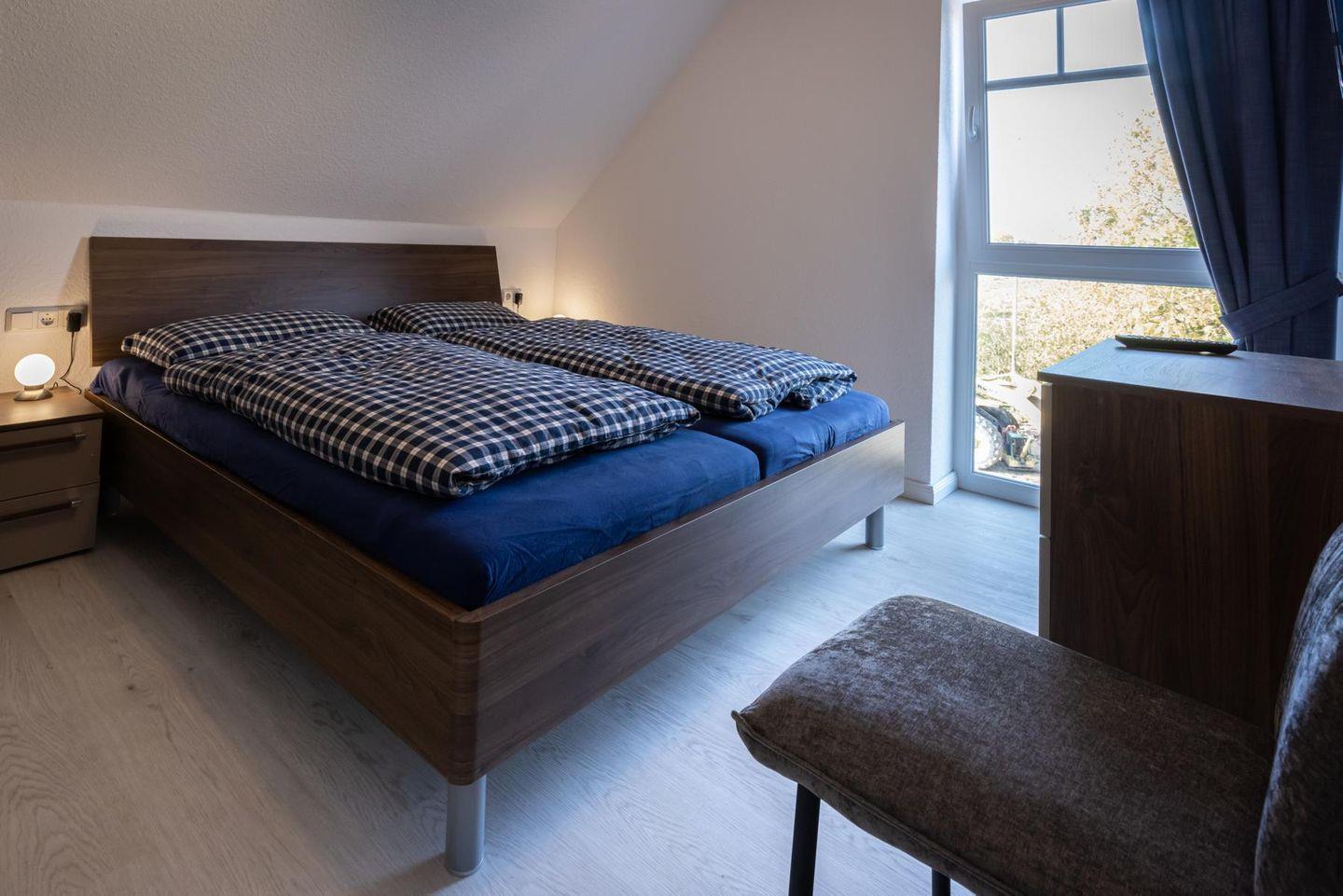 Weiterhin findet sich auf der OG-Ebene ein Schlafzimmer mit Doppelbett, Kleiderschrank und ein HD-TV. Direkt neben an befindet sich das trendige Bad mit verglaster Duschkabine, Handtuchheizkörper sowie Fön.