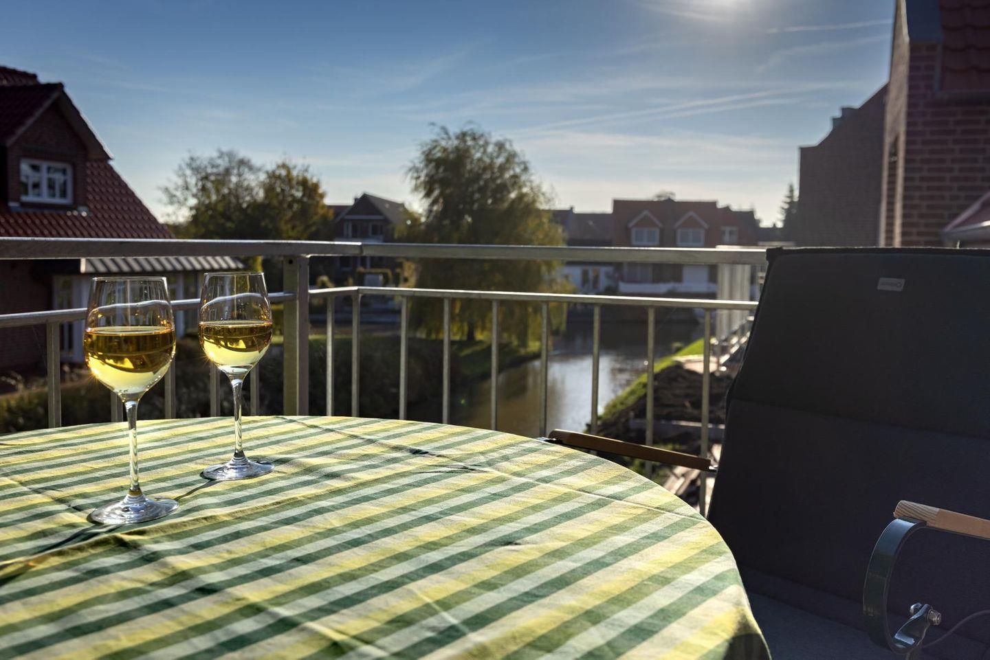 Unsere neue OG-Ferienwohnung „binnen un´ buten“ mit Balkon und Wasserblick liegt im 2021 erbauten Grachtenpark.