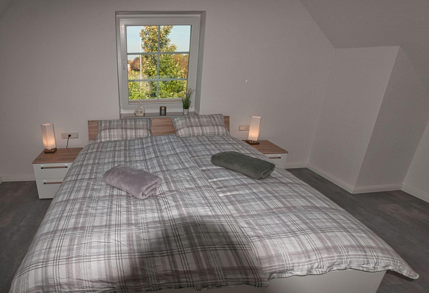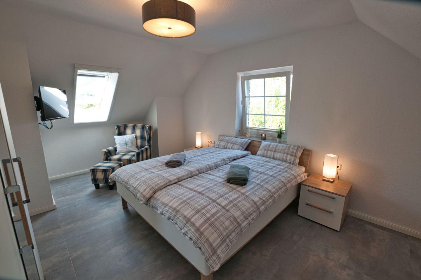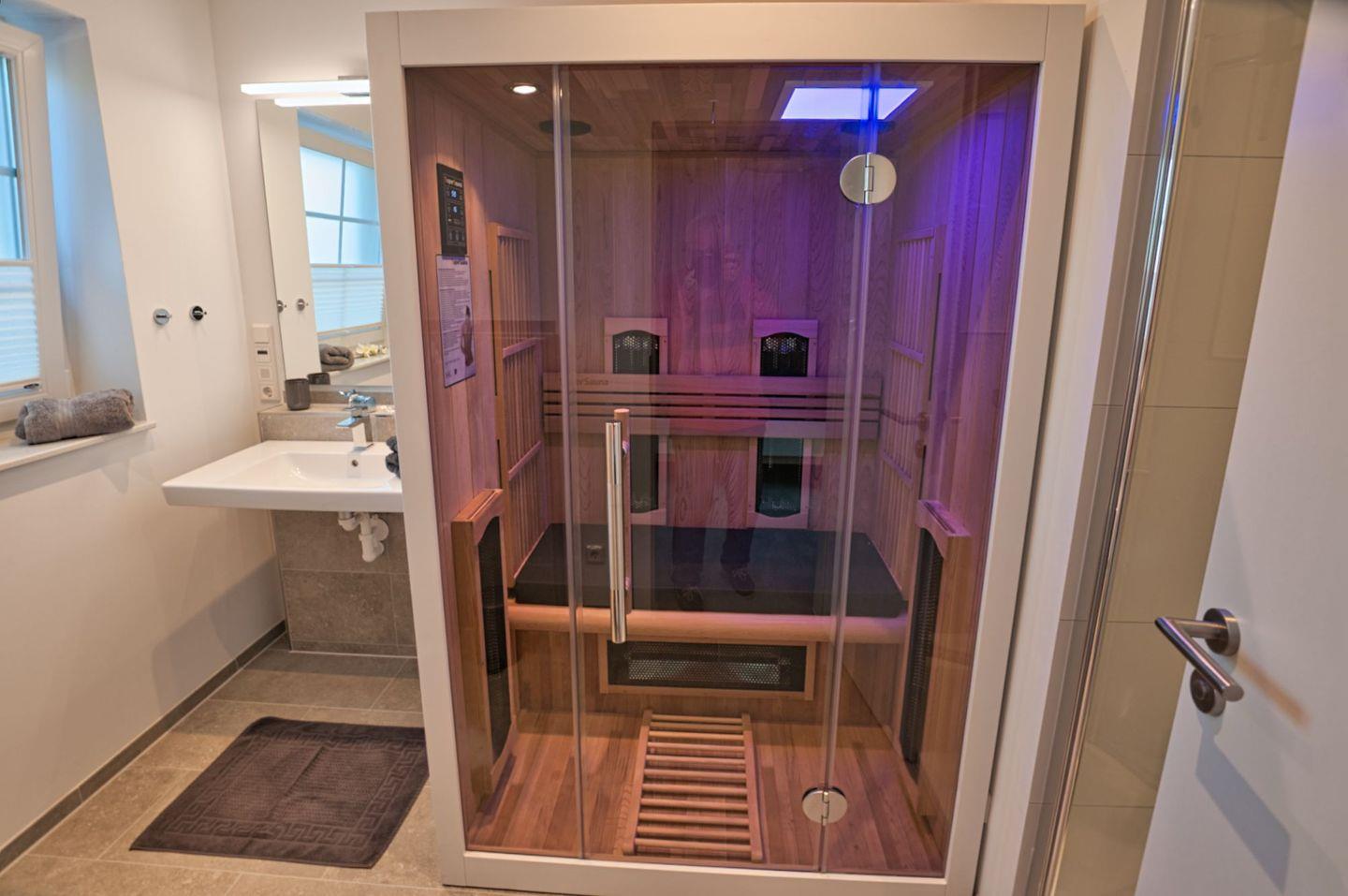 Im EG befindet sich ein Schlafzimmer mit Doppelbett 1,80m x 2,00m, Kleiderschrank und Kommode, sowie ein großes Wellness-Badezimmer mit ebenerdiger Rainshower-Dusche (1,00m x 1,30m) und einer Infrarotsauna für zwei Personen.