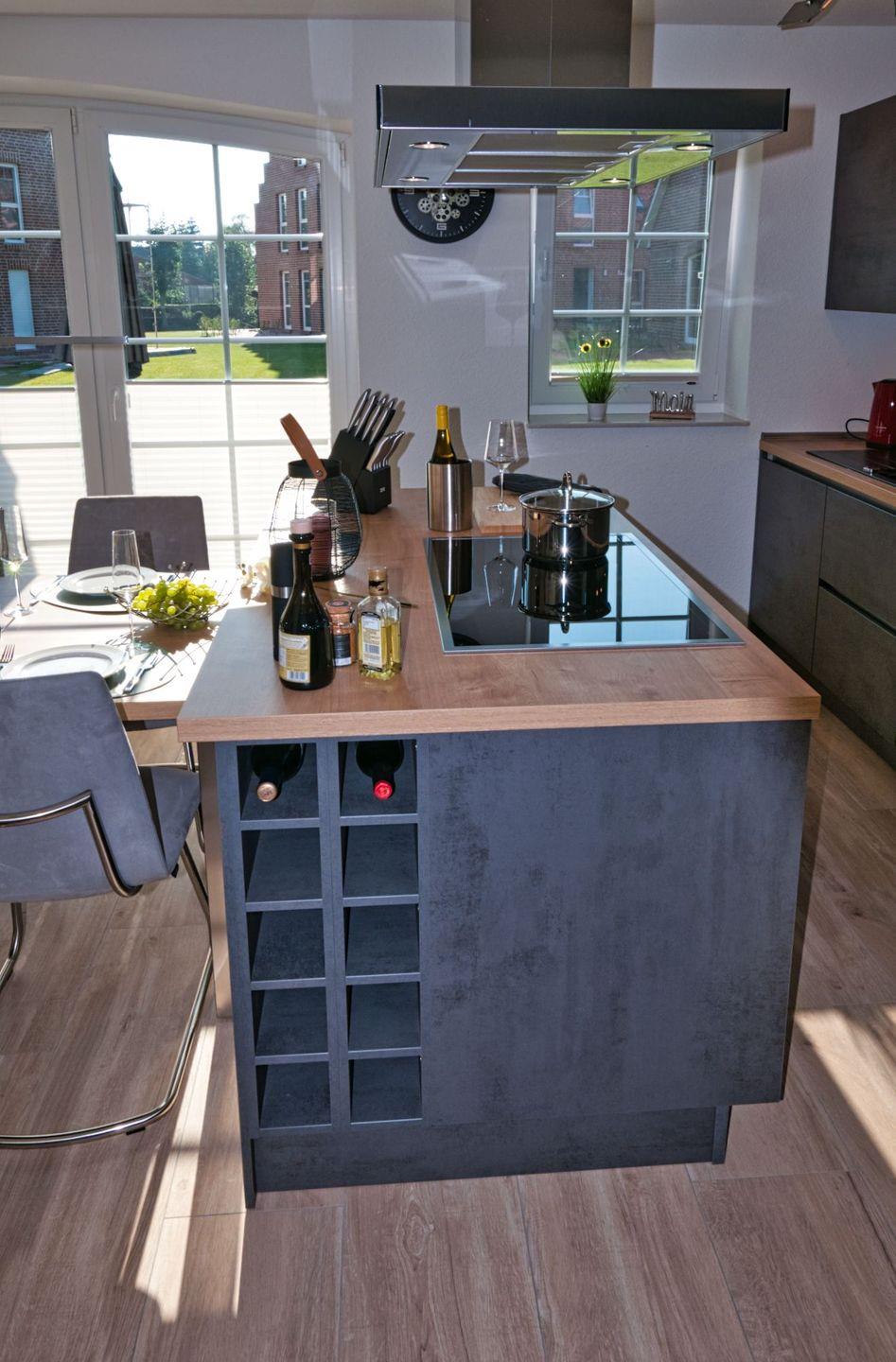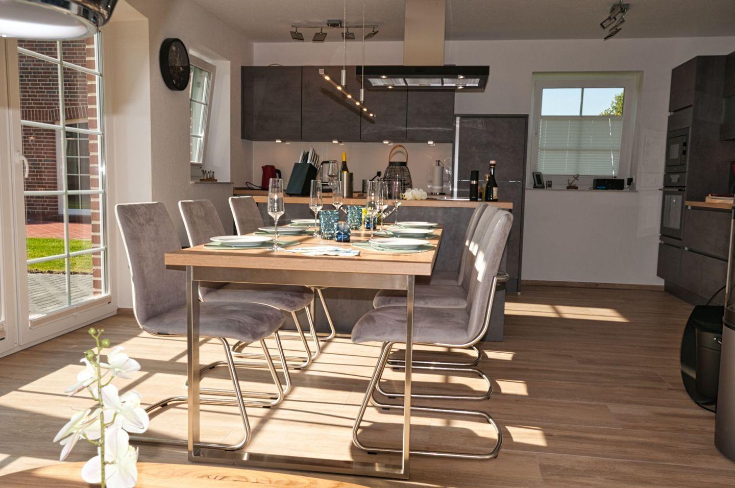 Im Erdgeschoss befindet sich ein großer, lichtdurchfluteter Wohn- Essbereich mit einer modernen, komplett ausgestatteten Küche mit großer Kochinsel. Durch die Ausrichtung dieser zum angebauten zwei Meter langen Esstisch für sechs Personen besteht beim Kochen die Möglichkeit, beim Front-Cooking Kontakt zu den weiteren Gästen zu halten. Hier macht das Kochen Freude! Hochwertiges Geschirr, Besteck und Gläser stehen für mehrere Menügänge bereit. Die Küche verfügt über Geschirrspülmaschine, Kühlschrank mit großem, separatem Gefrierfach, Mikrowelle mit Grillfunktion, Backofen, ein großes Induktionskochfeld mit erweiterbaren Kochzonen, Wasserkocher, Kaffeemaschine, Padmaschine (Tassimo / Bosch), Toaster, Mixer, Eierkocher, Pürierstab und vieles mehr.