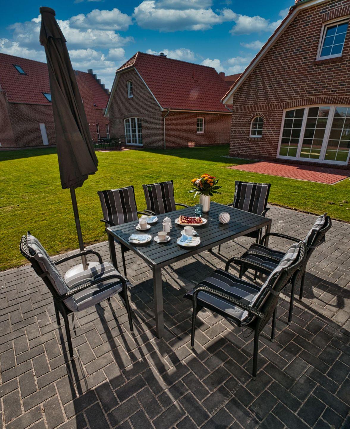 Die 20m² große Terrasse mit Süd- Ostausrichtung verwöhnt Sie von morgens bis zum späten Nachmittag mit Licht und Wärme. Gartenmöbel für sechs Personen, ein Kugelgrill mit Grillbesteck und ein großer Sonnenschirm mit Lichtfunktion für die Abendstunden laden zum Verweilen ein. Die Terrasse ist überdacht und der Garten ist eingezäunt.