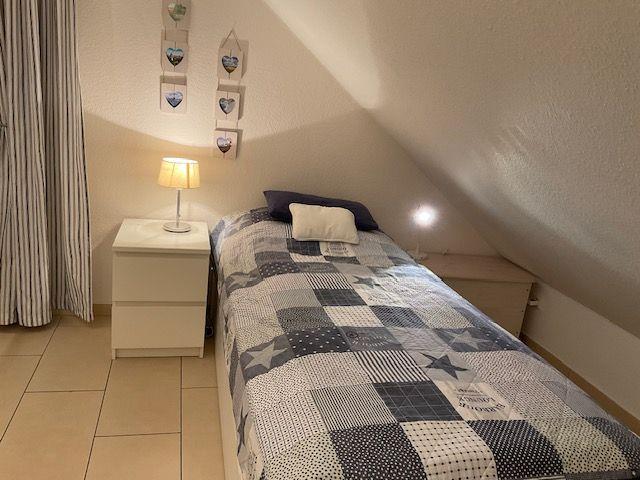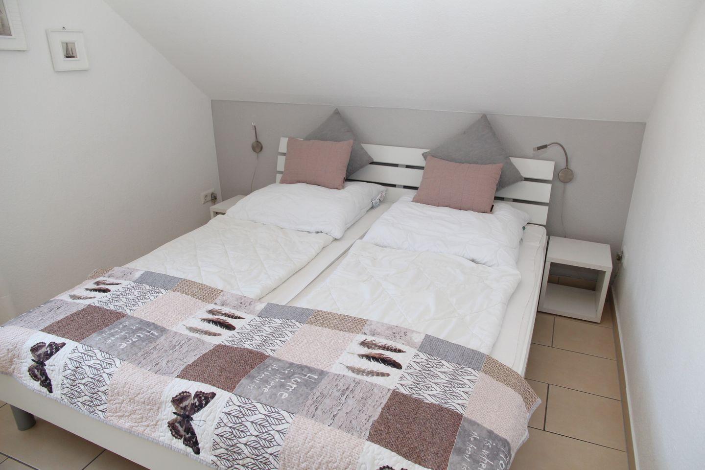 Die 3 Schlafzimmer (alle Betten 2 m x 1,80 m) mit jeweils 2 Betten (einmal 3 Betten im OG) verteilen sich auf das Erdgeschoss (1) und im Obergeschoss (2). An den Fenstern sind Rollläden (auch im EG-Bad). In einem Schlafzimmer befindet sich noch ein 21 Zoll Flachbildfernseher mit integriertem DVD-Player und im weiteren großzügigen (Kinder-) Schlafzimmer TV und CD-Radio-Kassettengerät. Außerdem steht kostenlos ein Kinderreisebett und ein Hochstuhl zur Verfügung.