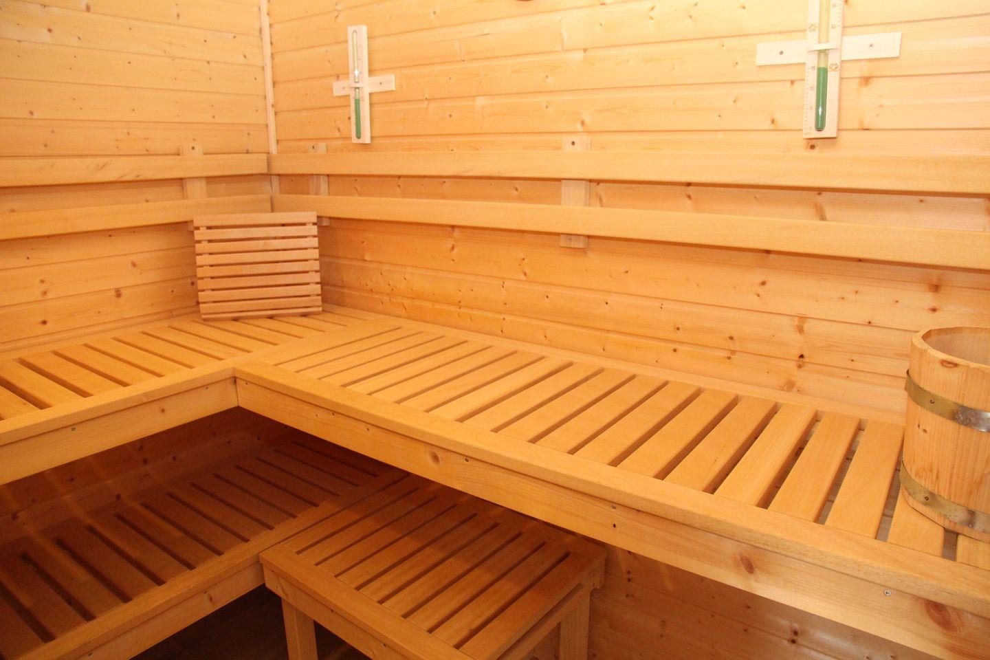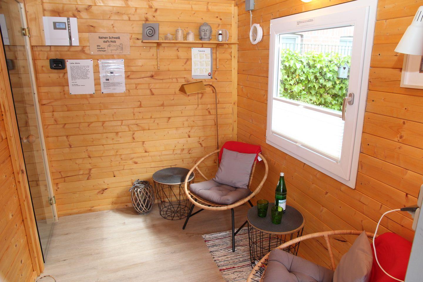 Außensauna mit kleinem Ruheraum, Benutzung gegen eine einmalige Gebühr von 25 € für den gesamten Aufenthaltszeitraum plus 5 Euro für die Endreinigung. Neu ist nun auch direkt angrenzend eine Außendusche vorhanden.