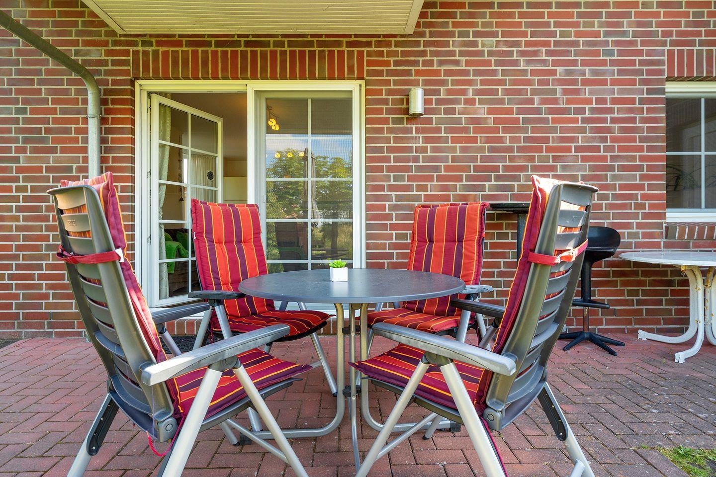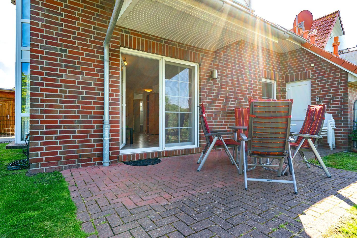 Terrasse mit Mobiliar, Liegewiese mit 2 Liegen, Sonnenschirm und ein Tischgrill. Es gibt ein Gartenhaus mit ausreichend Platz zur Unterbringung von Fahrrädern, Kinderwagen u.a.