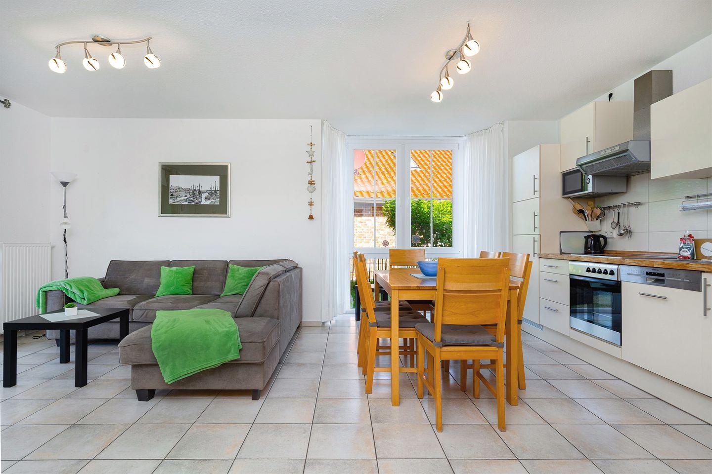 Großer Wohn-/Essbereich mit voll ausgestatteter Küche z. B. Mikrowelle, Backofen, Spülmaschine, Cerankochfeld, Kühlschrank mit großem Gefrierfach, Kaffeemaschine, Toaster, Wasserkocher, u.v.m.