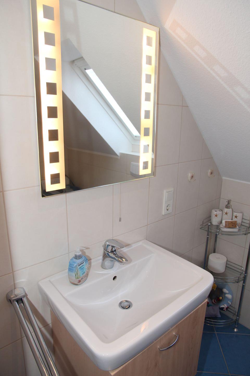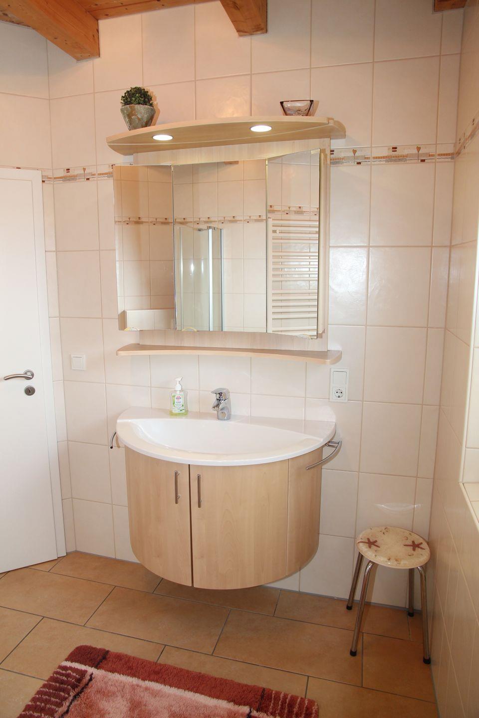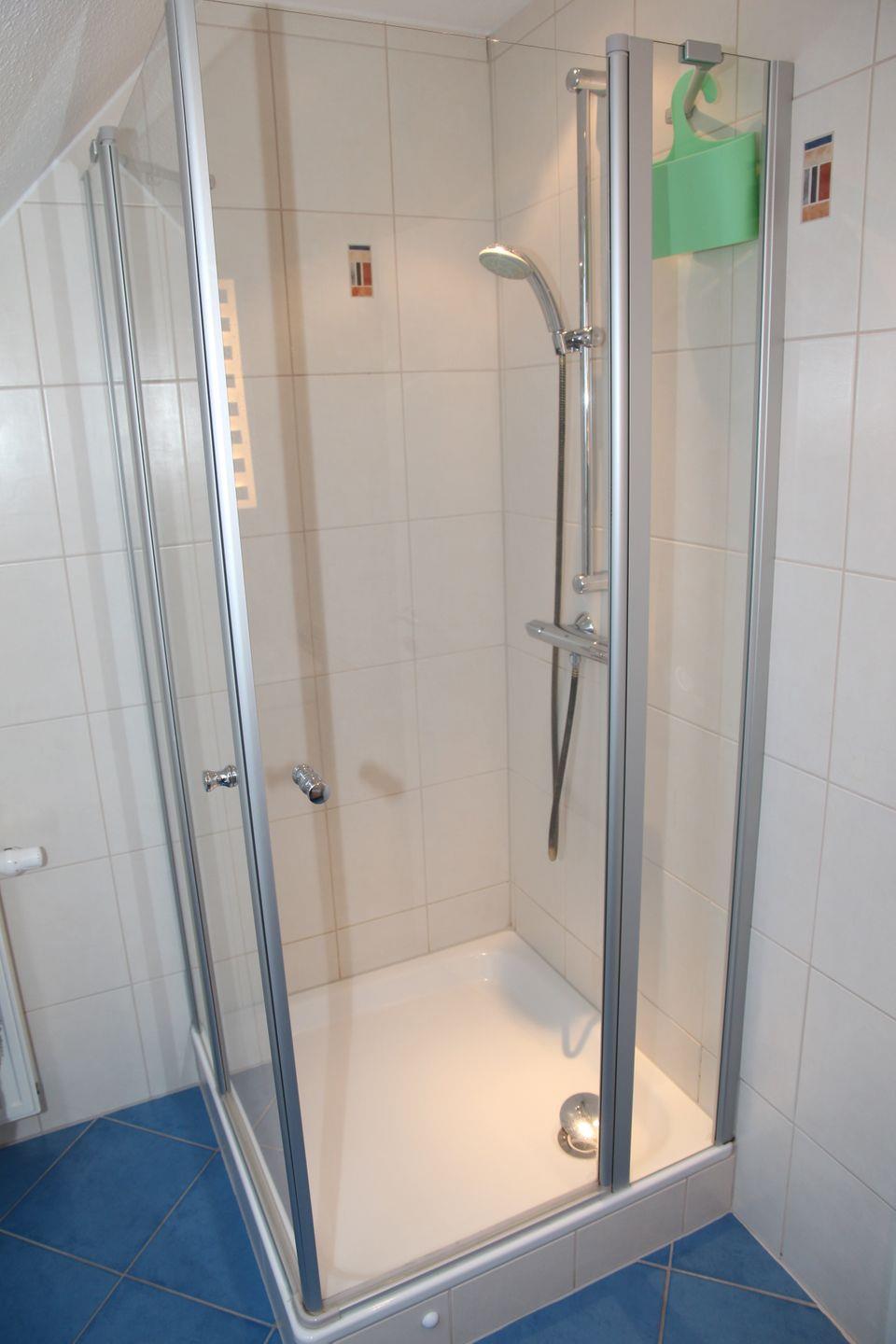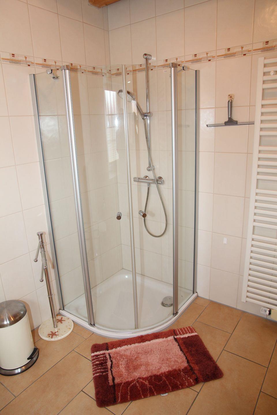 Das Badezimmer im EG verfügt über eine Dusche mit niedrigem Einstieg, Handtuchwärmer sowie Föhn.