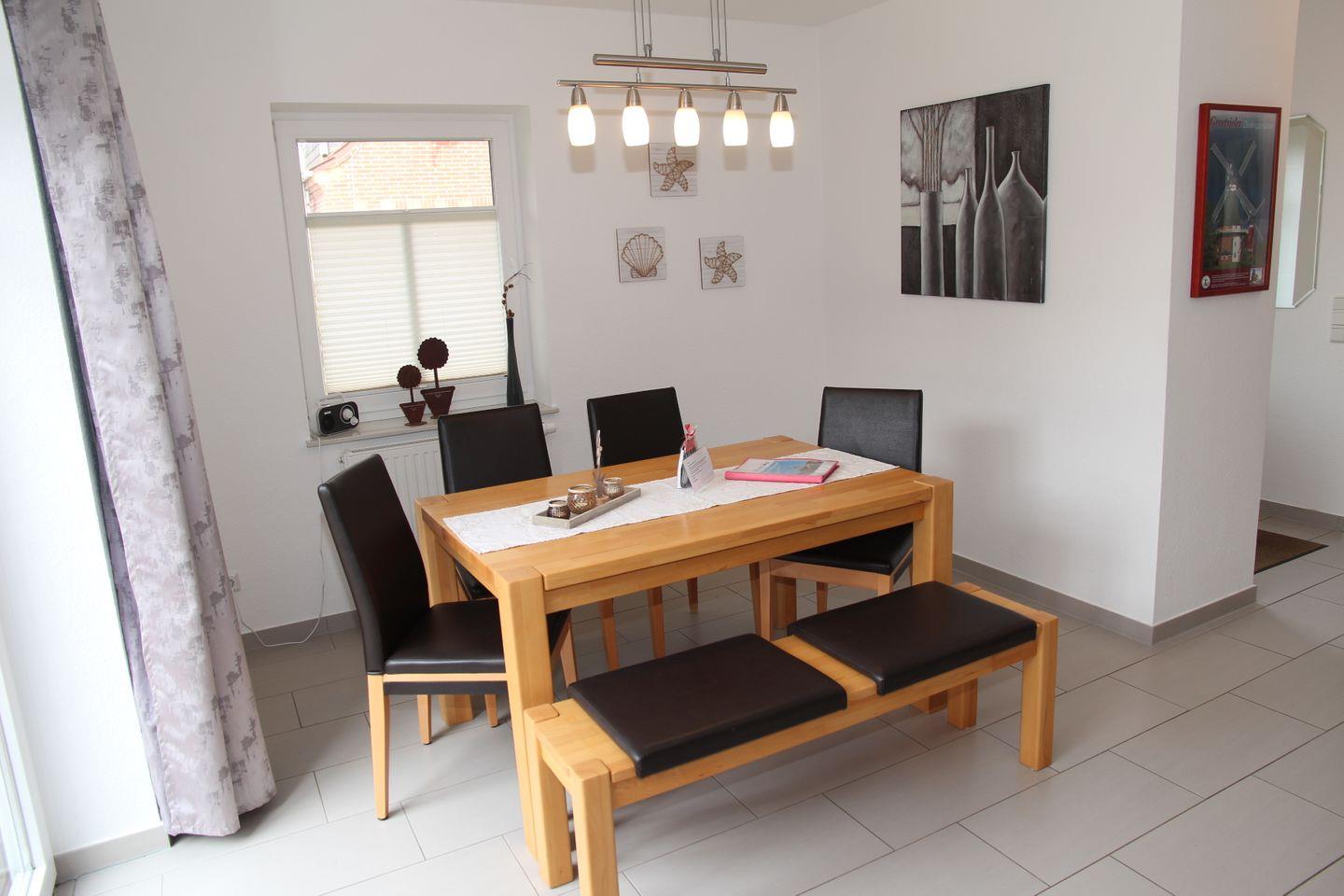 Die Sommerbrise verfügt über 2 Schlafzimmer (Doppelbett + 2 Einzelbetten) die sich im Obergeschoss befinden. Die Schlafräume lassen sich mit Außenjalousien abdunkeln. Auch ein Gäste-WC befindet sich auf der oberen Etage. Das WC ist gefliest, die Schlafräume sind mit Laminat ausgelegt. Das Erdgeschoss ist komplett gefliest und verfügt über Fußbodenerwärmung. Das große Wohn-Esszimmer ist geschmackvoll eingerichtet . Die separate Küche verfügt über eine Geschirrspülmaschine, Kaffeemaschine, Senseo-Padmaschine, Wasserkocher, Toaster, Mikrowelle, Backofen, Kühlschrank mit Gefrierfach u.v.m. Das helle Duschbad mit Waschmaschine befindet sich ebenfalls im Erdgeschoss.