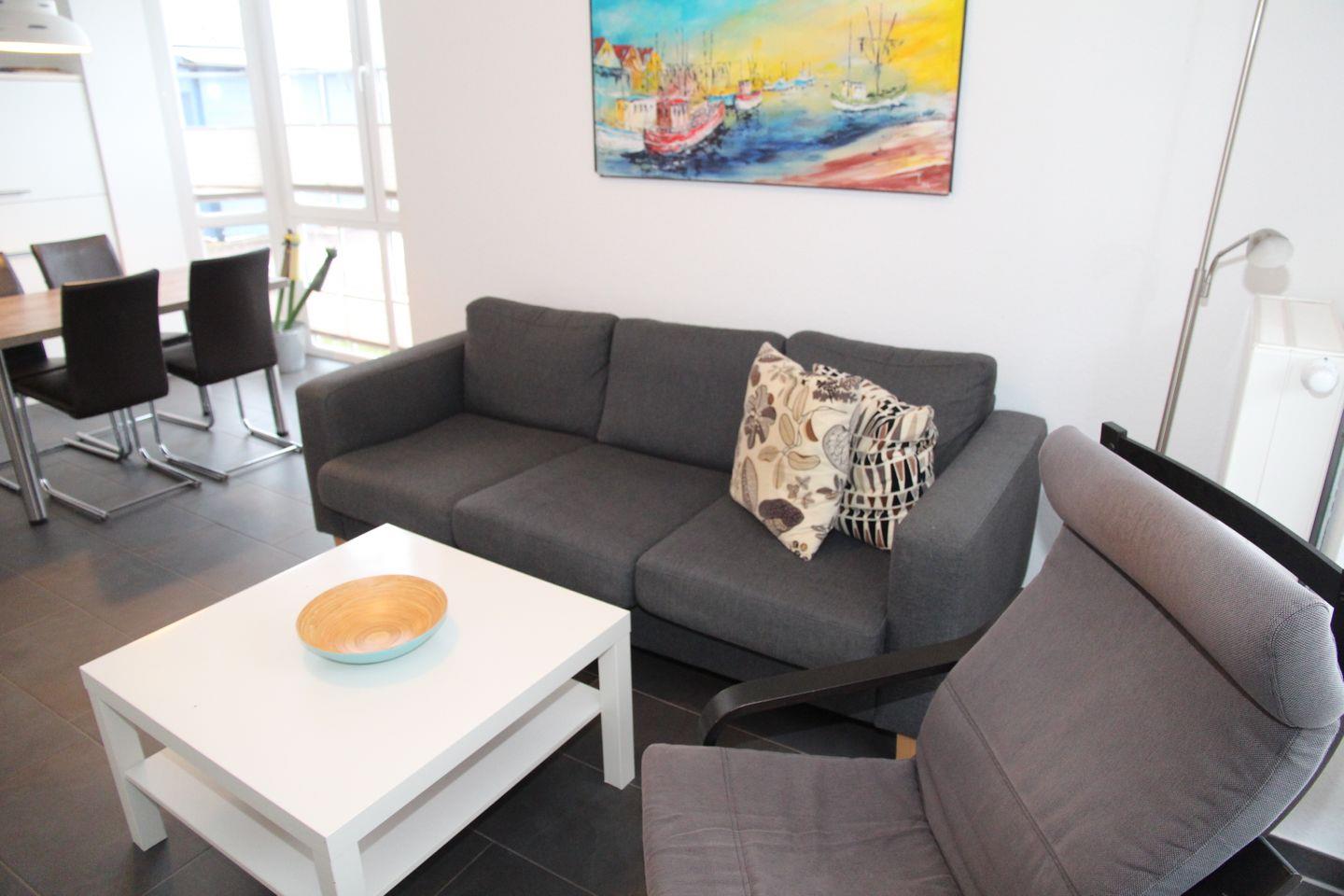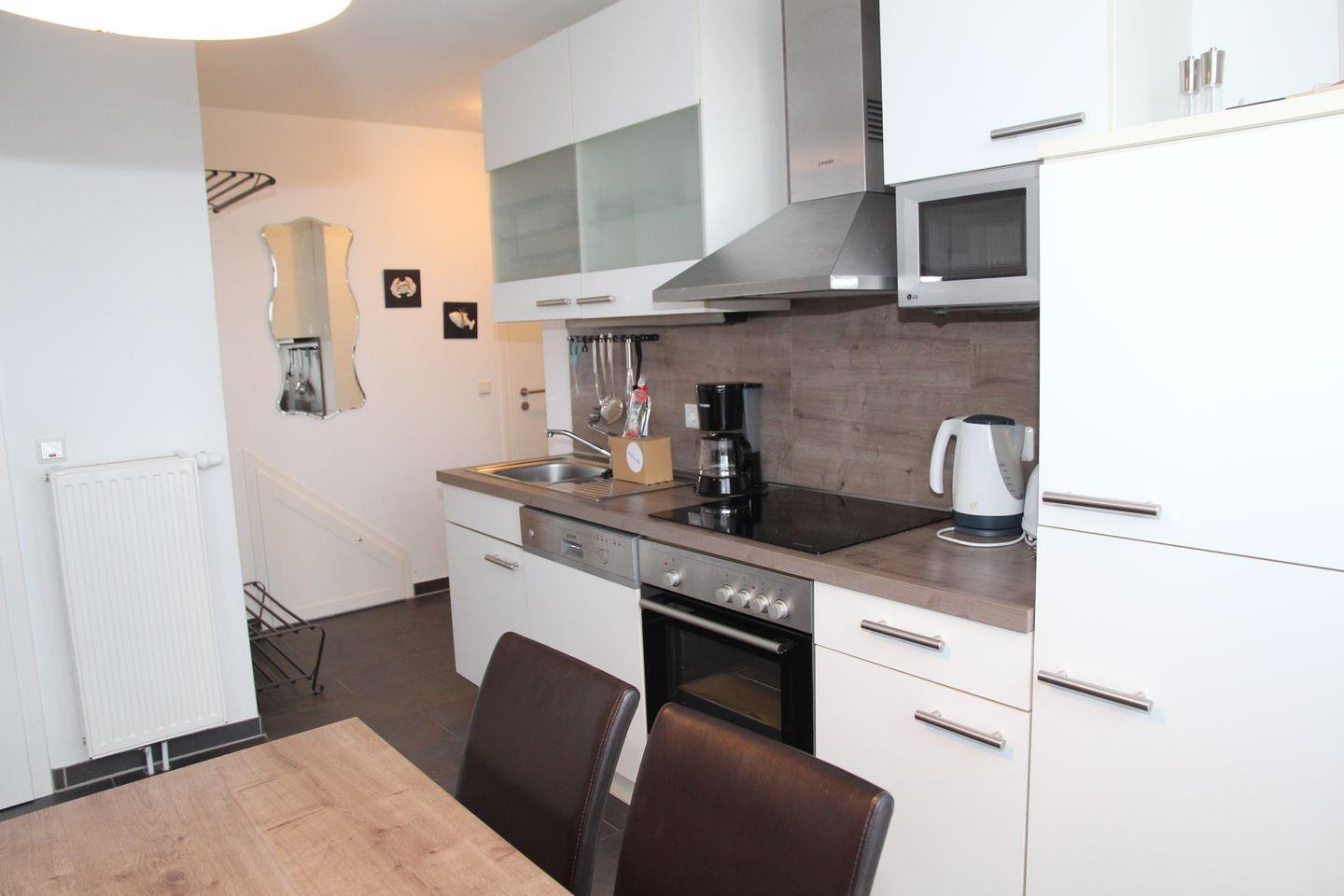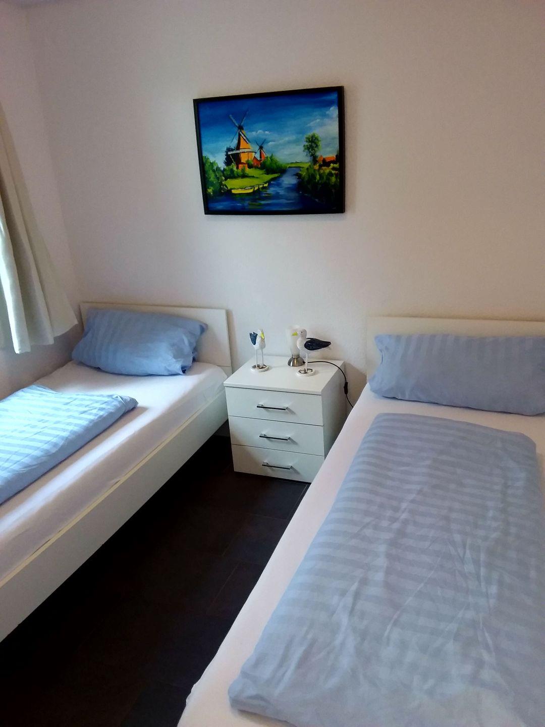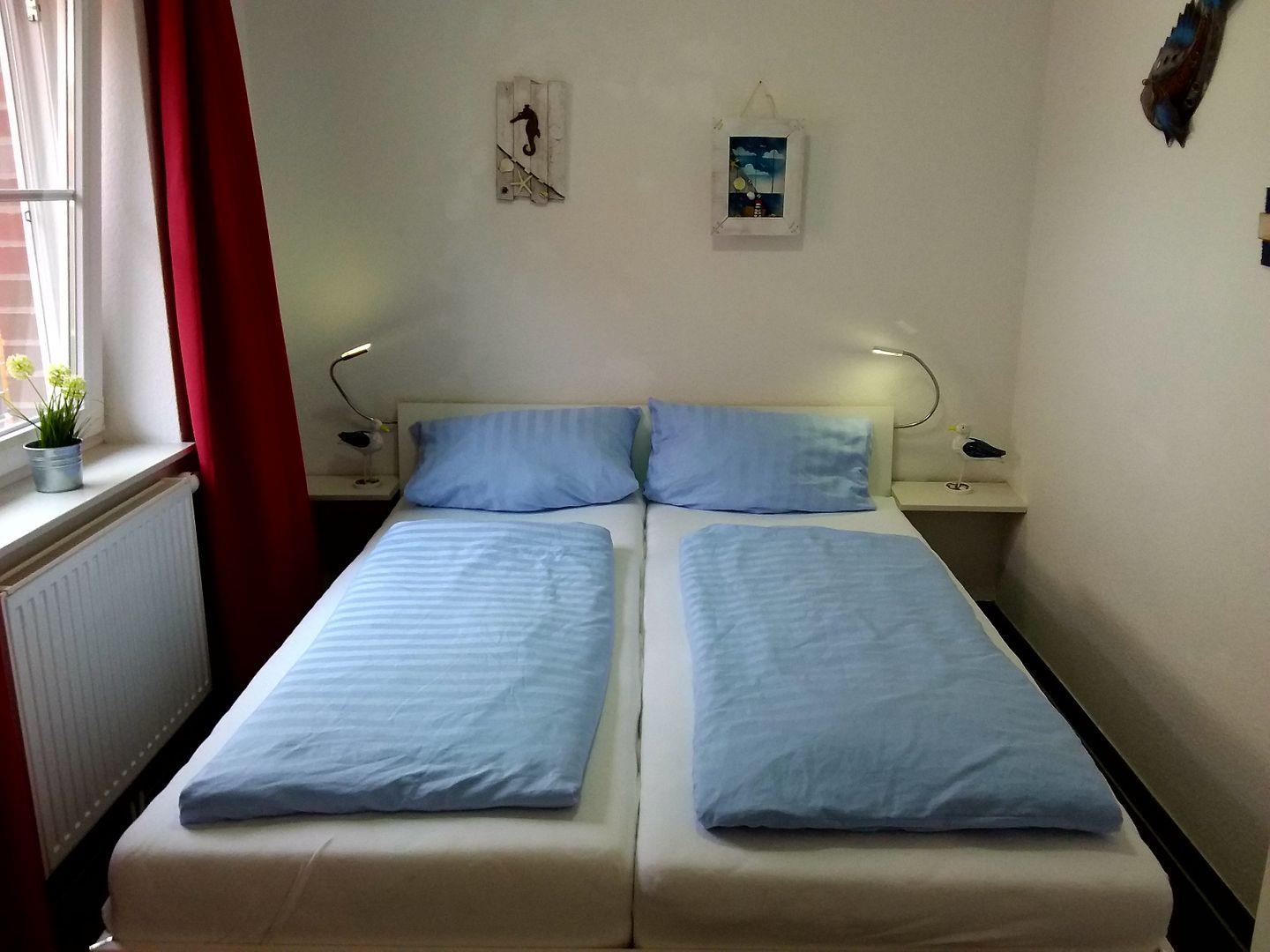 Die modern eingerichtete Erdgeschosswohnung mit Garten (komplett umzäunt) und Terrasse, im Klaus-Störtebeker-Weg 20, verfügt über ein Schlafzimmer mit einem Doppelbett und ein Schlafzimmer mit 2 Einzelbetten. Die Schlafzimmer können mit Außenjalousien verdunkelt werden. Das Wohn- Esszimmer mit Erker (mit Plisees), verfügt über eine modern eingerichtete Küchenzeile mit Cerankochfeld, Spülmaschine, Backofen, Mikrowelle, Kühlschrank mit separatem Gefrierfach, Kaffeemaschine, Toaster und Wasserkocher. Fliegengitter sind vorhanden.