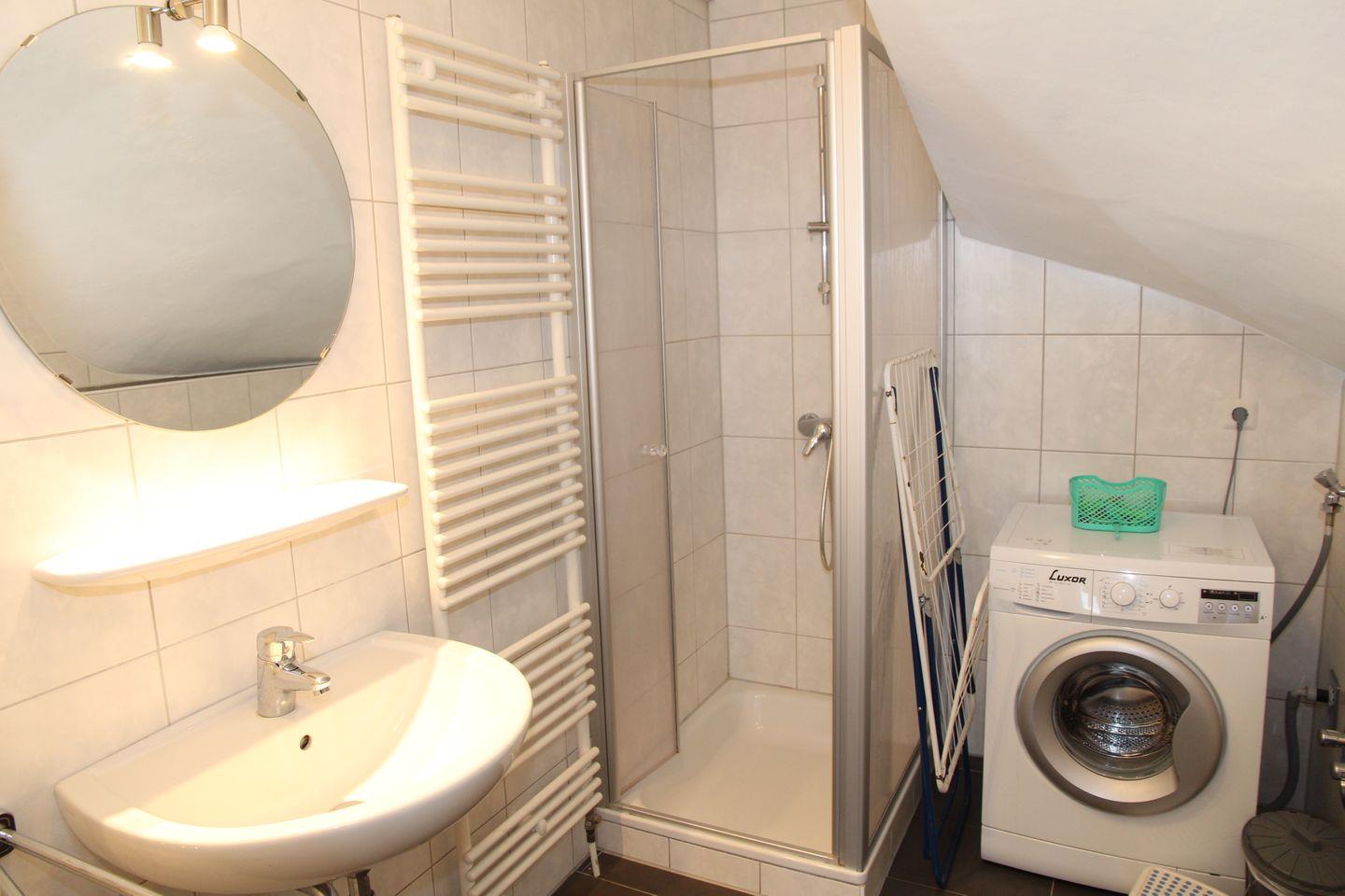 Dusche/WC ist mit einer Waschmaschine, Wäscheständer, einem Handtuchheizkörper und einem Föhn ausgestattet. Die Wohnung ist komplett gefliest.