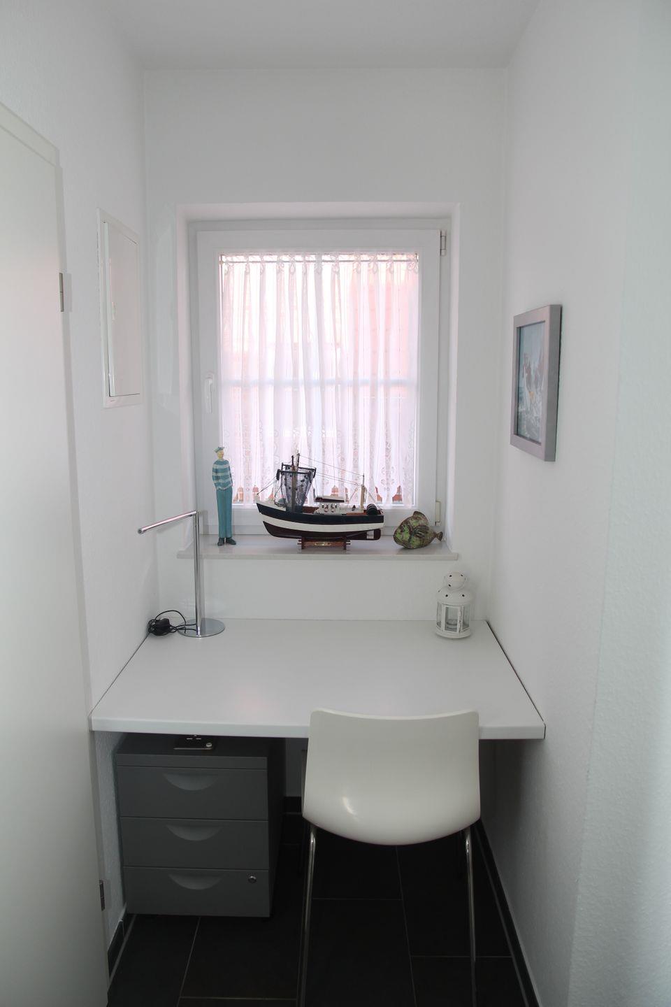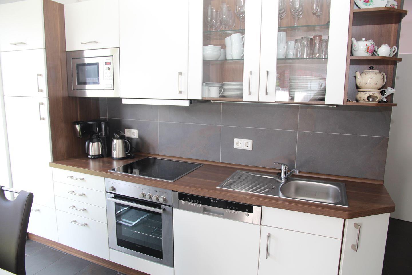 Der Wohn-/Essbereich verfügt über eine hochwertige Einbauküche mit Cerankochfeld, Dunstabzugshaube, Backofen, Mikrowelle, Kühlschrank mit separatem Gefrierfach, Geschirrspüler, Kaffeemaschine, Toaster, Wasserkocher, Mixer, Eierkocher, Bügeleisen sowie ausreichend Geschirr, Gläser (auch Wein-, Sekt- und Biergläser) und Besteck.