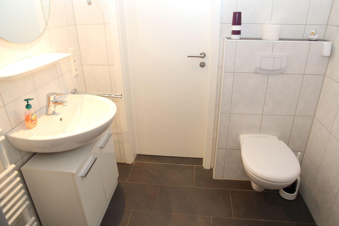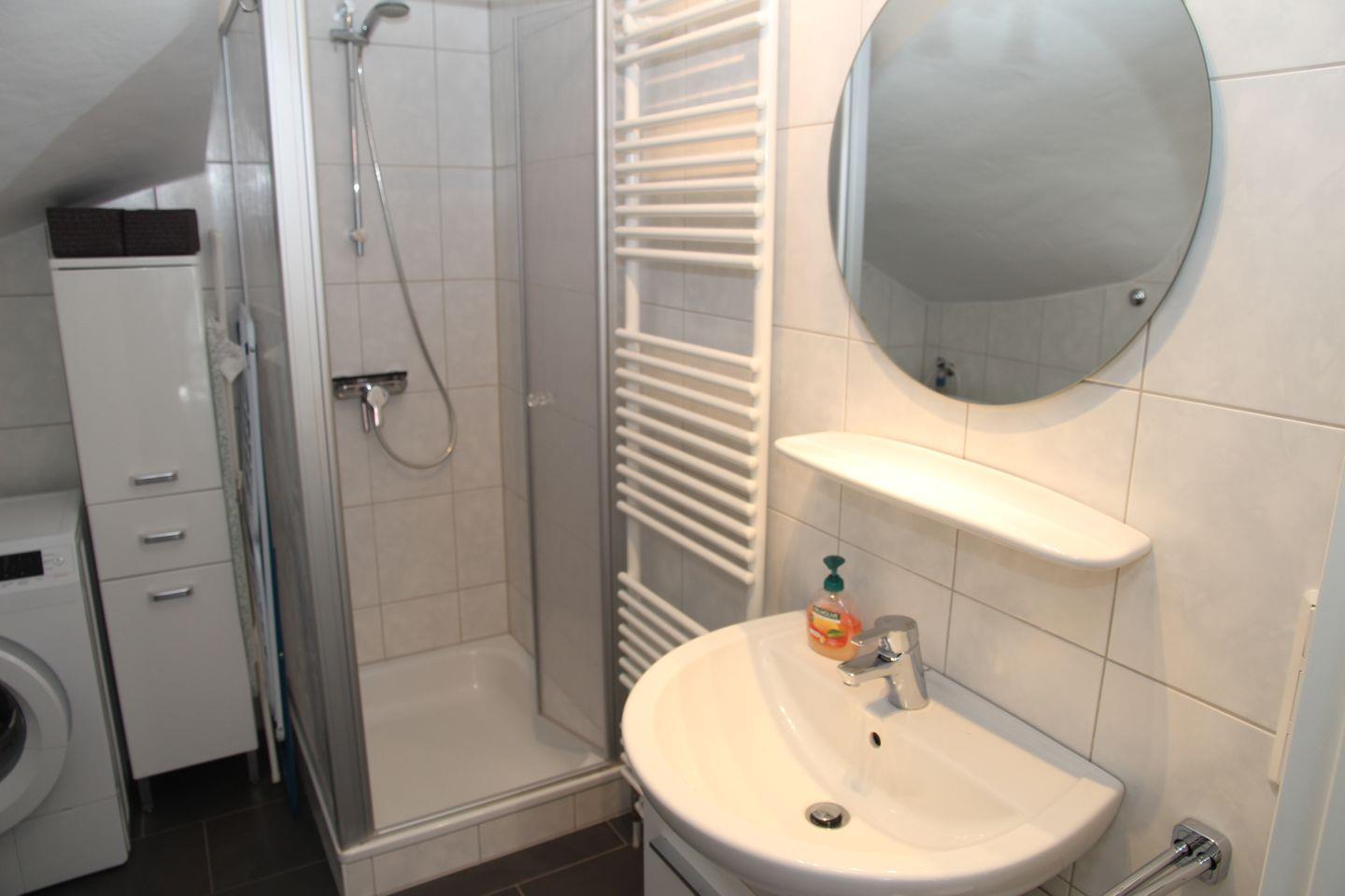 Das Badezimmer ist mit Dusche/WC, einer Waschmaschine, einem Wäscheständer sowie Föhn und einem Handtuchheizkörper ausgestattet.