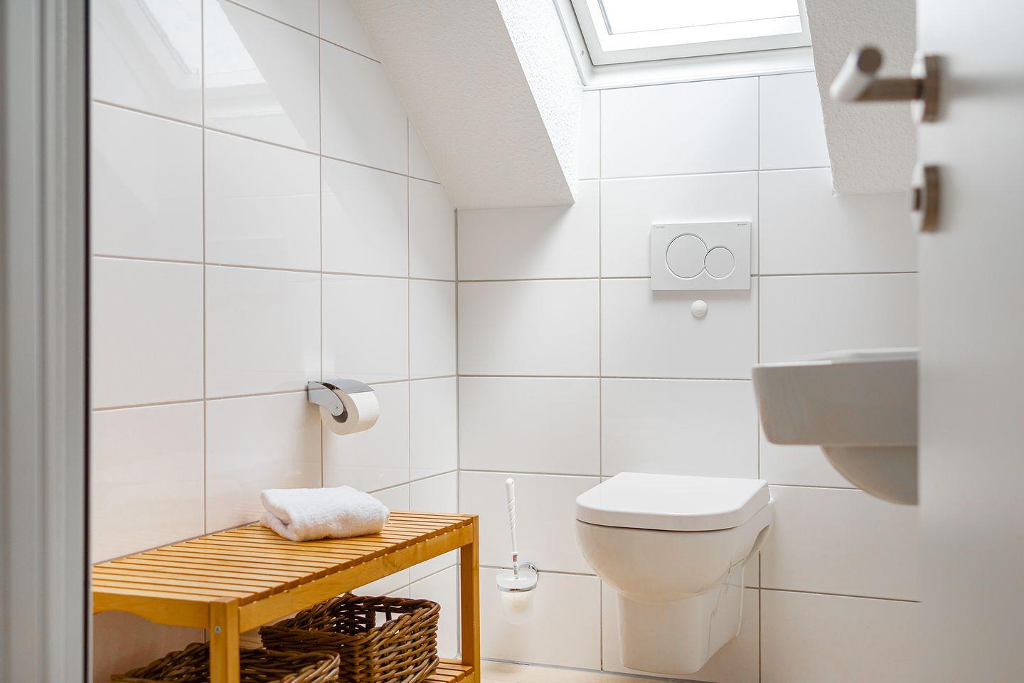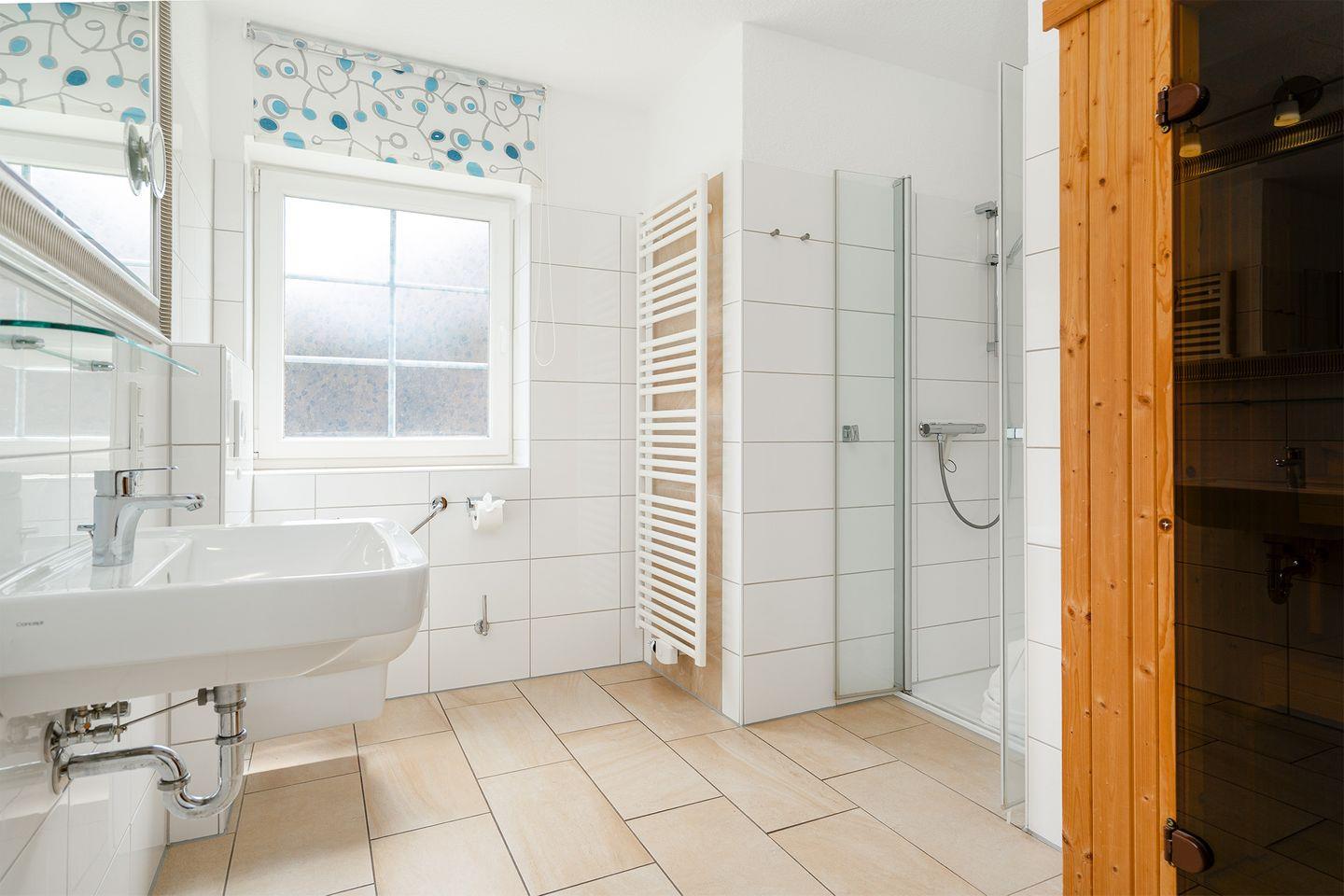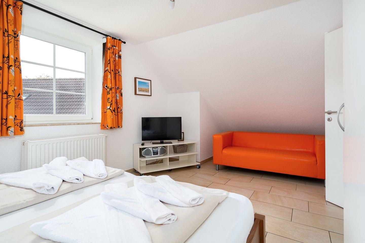 Im Obergeschoss befinden sich 2 weitere Schlafzimmer (Doppelbett und 2 Einzelbetten) und ein Badezimmer mit Dusche. Im Schlafzimmer mit Doppelbett befindet sich noch eine gemütliche Couch und ein zweiter Flachbildfernseher.