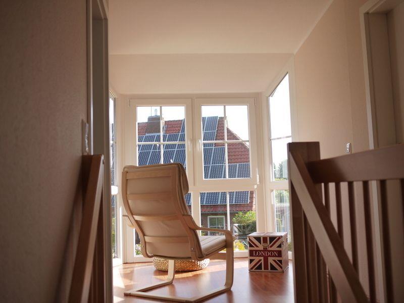 Im Obergeschoss gibt es 2 Schlafzimmer mit 1 Doppelbett (2x 90 x 2m) + 2 Einzelbetten 90 x 2 m. Das große Schlafzimmer verfügt über einen internetfähigen Flachbild-TV, ein klappbares Kinderbett, einen Schreibtisch und einen Schiebetüren-Wandschrank. Die Einzelbetten im kleinen Schlafzimmer lassen sich zusammenschieben. Beide Schlafzimmer sind mit Fliegengittern ausgestattet. Der Fußboden im gesamten Obergeschoss ist mit Laminat ausgelegt. Im lichtdurchfluteten Erker gibt es einen gemütlichen Lesesessel. Das Duschbad hat eine Echtglas-Dusche mit niedrigem Einstieg und ein Radio.