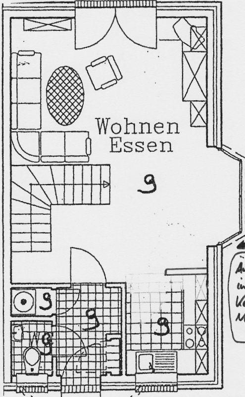 Im EG gibt es ein Bad mit Toilette, (Duschhocker und 1 Haltegriff - individuell anzubringen), sowie einen weiteren Abstellraum mit Waschmaschine. Es gibt ein Bügelbrett und einen Wäscheständer, sowie einen Grill.