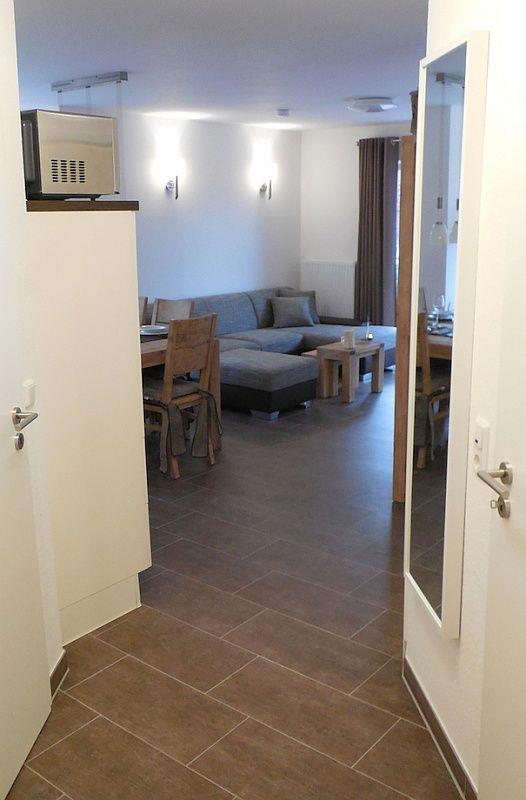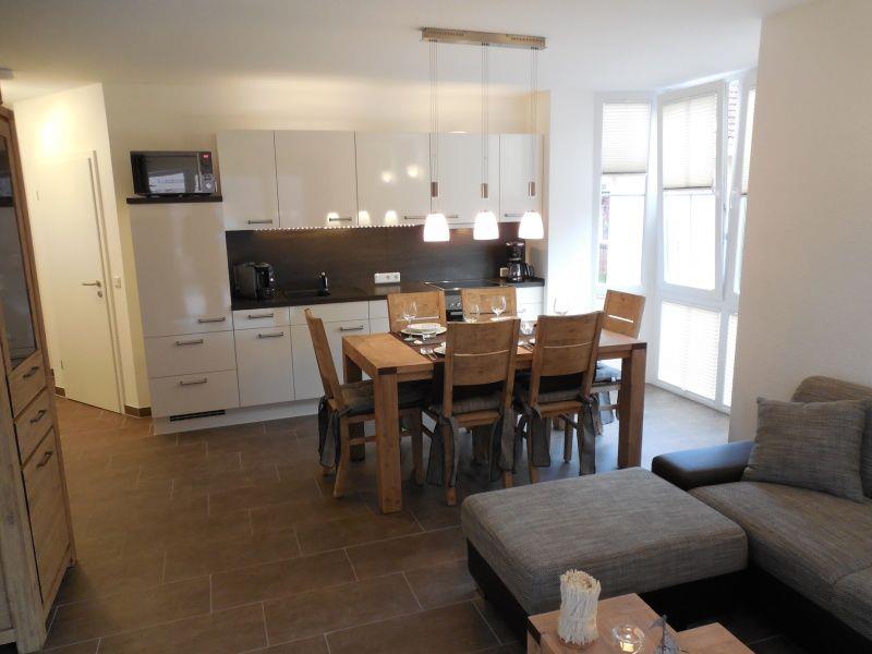 Die Nichtraucherwohnung mit lichtdurchflutetem Erker (Plissees) verfügt über einen schicken Wohn-/Essbereich mit TV, DVD- und Musikanlage (CD, USB, MP3). Die hochwertige Küche ist reichhaltig ausgestattet mit Backofen-/Mikrowelle, Kühl- und Gefrierfach, Geschirrspülmaschine, Kaffeemaschine, Tassimo-Kaffeepadautomat, Mixer, Wasserkocher, Toaster, u.v.m.