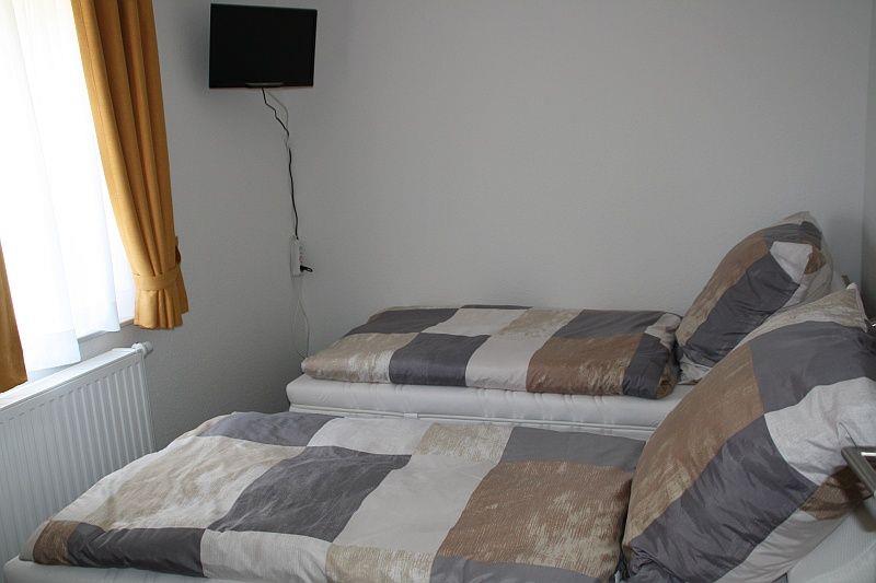 2 Schlafzimmer (1 x mit Doppelbett und Kleiderschrank, 1 x mit 2 Einzelbetten und Kleiderschrank sorgen für erholsamen Schlaf. Ein zweiter Fernseher steht zur Verfügung. Es gibt ein Duschbad (Waschmaschine, Föhn vorhanden!) und ein sep. Gäste-WC.