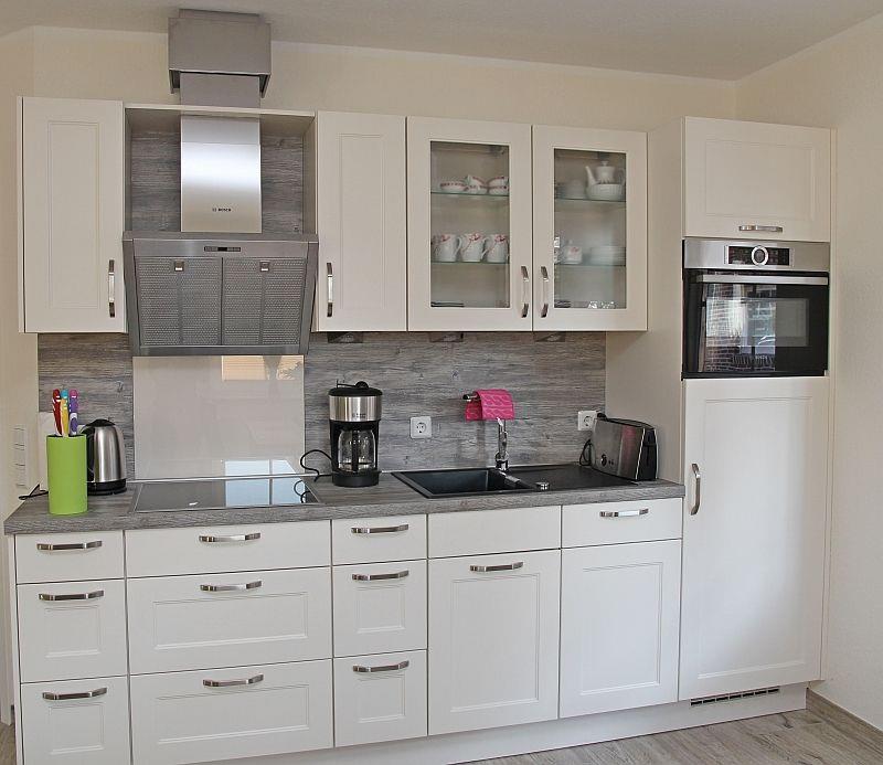Die hochwertige Küche ist reichhaltig ausgestattet: Geschirr, Töpfe, Besteck, Tassimo-Kaffeemaschine, Stabmixer, Wasserkocher, Toaster, Spülmaschine, Mikrowelle, Backofen, Kühlschrank (kein Gefrierfach)