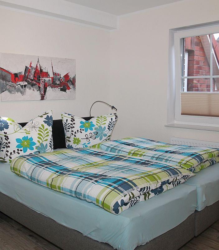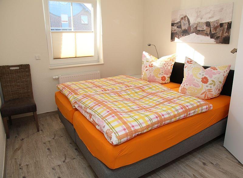 Beide Schlafzimmer sind mit einem Mustering-Boxspring-Doppelbett ausgestattet. In einem Schlafzimmer befindet sich ein weiterer Fernseher. Die Schlafräume sind mit Außenrollos und Fliegengitter versehen.
